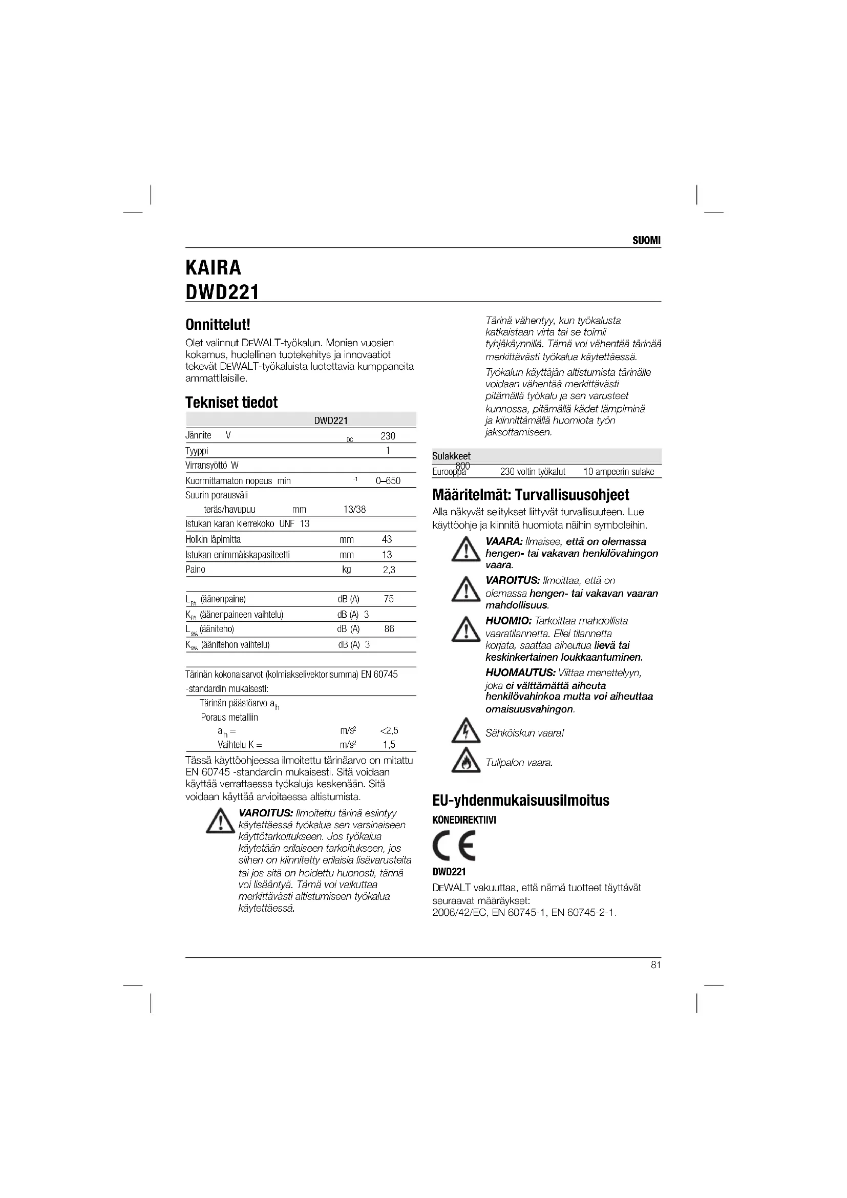 KAIRA DWD221 Onnittelut! Olet valinnut DEWALT-työkalun. Monien vuosien kokemus, huolellinen tuotekehitys ja innovaatiot tekevät DEWALT-työkaluista luotettavia kumppaneita ammattilaisille. Tekniset tiedot DWD221 Jännite V
