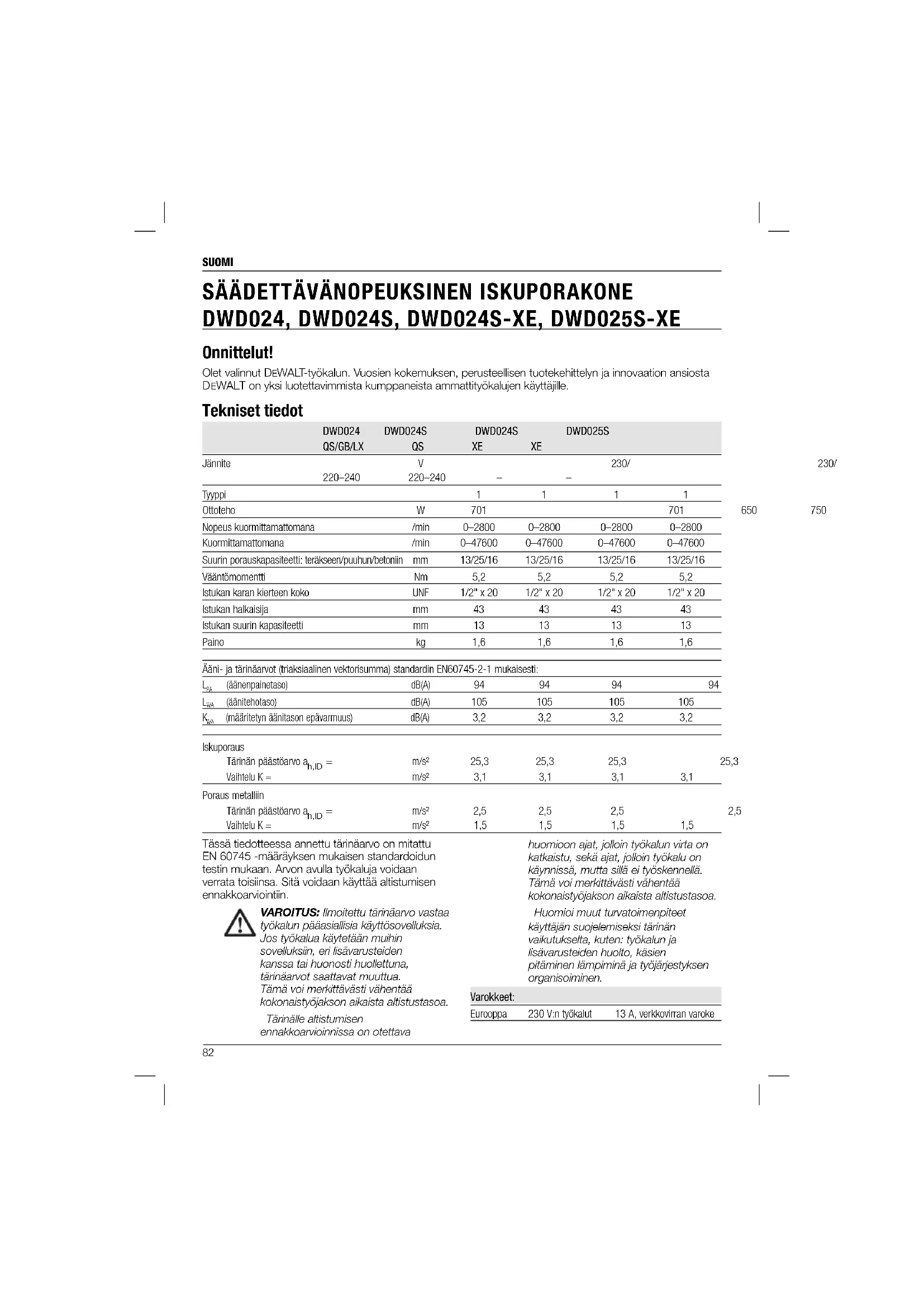 DWD024, DWD024S, DWD024S-XE, DWD025S-XE Tässä tiedotteessa annettu tärinäarvo on mitattu EN 60745 -määräyksen mukaisen standardoidun testin mukaan. Arvon avulla työkaluja voidaan verrata toisiinsa. Sitä voidaan käyttää altistumisen ennakkoarviointiin. VAROITUS: Ilmoitettu tärinäarvo vastaa työkalun pääasiallisia käyttösovelluksia. Jos työkalua käytetään muihin sovelluksiin, eri lisävarusteiden kanssa tai huonosti huollettuna, tärinäarvot saattavat muuttua. Tämä voi merkittävästi vähentää kokonaistyöjakson aikaista altistustasoa. Tärinälle altistumisen ennakkoarvioinnissa on otettava huomioon ajat, jolloin työkalun virta on katkaistu, sekä ajat, jolloin työkalu on käynnissä, mutta sillä ei työskennellä. Tämä voi merkittävästi vähentää kokonaistyöjakson aikaista altistustasoa. Huomioi muut turvatoimenpiteet käyttäjän suojelemiseksi tärinän vaikutukselta, kuten: työkalun ja lisävarusteiden huolto, käsien pitäminen lämpiminä ja työjärjestyksen organisoiminen. Varokkeet: Eurooppa 230 V:n työkalut 13 A, verkkovirran varoke83 SUOMI VAROITUS: Vähennä tapaturmavaaraa lukemalla ohje. Yleiset sähkölaitteita koskevat turvavaroitukset VAROITUS! Lue kaikki turvallisuusvaroitukset ja -ohjeet. Varoitusten ja ohjeiden noudattamatta jättäminen saattaa aiheuttaa sähköiskun, tulipalon ja/tai vakavan vamman.