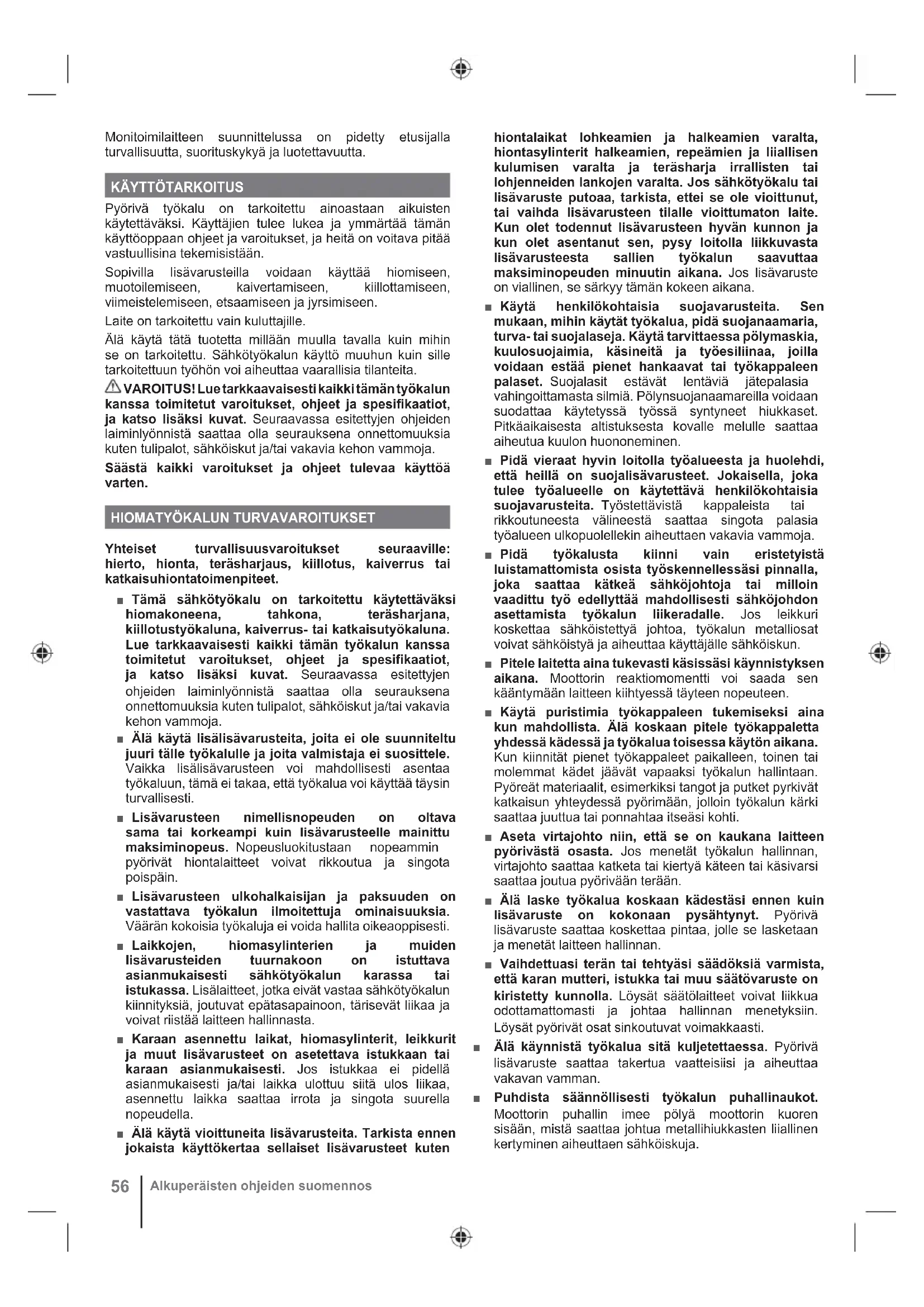 Laikan, hiomanauhan, harjan tai muun lisävarusteen puristuksiin jääminen tai juuttuminen voi aiheuttaa takapotkun. Pyörivän lisävarusteen puristuksiin jääminen tai juuttuminen pysäyttää pyörivän laikan nopeasti, mikä pakottaa poissa hallinnasta olevan sähkötyökalun vastakkaiseen suuntaan kuin lisävarusteen pyörimissuunta. Esimerkiksi, jos hiomalaikka jumiutuu tai puristuu kiinni työkappaleeseen, se laikan reunan kohta, joka koskettaa jumittumiskohtaa, voi kaivautua materiaalin pintaan, jolloin laikka kiipeää ulos tai ponnahtaa käyttäjää kohden. Pyörän voi joko hypätä kohti tai poispäin käyttäjästä riippuen suunnasta pyörän liikkeen paikassa puristimilla. Hiomalaikka saattaa myös haljeta pomppauksen seurauksena. Sen voi välttää eräillä varotoimenpiteillä: ■ Pidä tukevasti kiinni työkalusta ja pidä vartalosi ja käsivarret niin, että voit hallita mahdollisen pomppauksen. Käyttäjä voi hallita takapotkuvoimia varmistamalla asianmukaiset varotoimenpiteet. ■ Ole erikoisen valpas työstäessäsi särmiä, teräviä reunoja jne. Vältä lisävarusteen luisumista tai jumittumista. Kun työskentelet särmillä tai terävillä reunoilla tai jos työkalu pääsee luiskahtamaan, on sen jumiutumisvaara suurempi. Tällöin saatat menettää työkalun hallinnan ja aiheuttaa pomppauksen. ■ Älä kiinnitä työkaluun hammastettua sahanterää. Sellaisilla terillä on suurempi pomppausvaara ja työkalun hallinnan menetys. ■ Syötä aina kärkeä materiaaliin samassa suunnassa kuin leikkuureuna poistuu materiaalista (toisin sanoen samassa suunnassa, jonne lastut sinkoutuvat). Jos työkalua johdetaan väärään suuntaan, terän leikkuureuna nousee ylös työkappaleesta ja alkaa vetää työkalua tähän syöttösuuntaan. ■ Käytettäessä pyöriviä viiloja, katkaisupyöriä, nopeakäyntisiä leikkuuteriä tai volframikarbidi leikkuuteriä on aina varmistettava, että työkappale on tukevasti kiinni. Päästessään hiemankin kääntymään urassa viistosuunnassa nämä pyörät voivat potkaista takaisin. Jos katkaisupyörä juuttuu kiinni, tavallisesti itse pyörä rikkoutuu. Jos pyörivä viila, nopeakäyntinen leikkuuterä tai volframikarbidi leikkuuterä juuttuu kiinni, se voi ponnahtaa urasta ja saatat menettää työkalun hallinnan. Hiontaan ja katkaisemiseen liittyviä erityisiä turvallisuusvaroituksia ■ Käytä ainoastaan sähkötyökalulle suositeltuja laikkatyyppejä ja ainoastaan suositeltuihin tarkoituksiin. Älä esimerkiksi hio katkaisulaikan sivulla. Katkaisulaikat on tarkoitettu käytettäväksi siten, että hionta suoritetaan niiden ulkokehällä; niihin kohdistuvat sivuttaisrasitukset voisivat murtaa ne. ■ Käytä kierteisten hiontakartioiden ja tulppien tapauksessa ainoastaan vahingoittumattomia laikan karoja, joissa on kiinteä ja oikean kokoinen ja pituinen laikka. Asianmukainen kara pienentää rikkoutumisvaaraa. ■ Älä "jumita" katkaisulaikkaa tai käytä liiallista painetta. Älä yritä leikata liian syvälle. Jos laikkaan kohdistuu rasitusta, laikan tarttuminen tai kiertyminen on todennäköistä ja samoin kierto leikkuun aikana, jolloin vaarana on takaisku tai laikan rikkoontuminen. ■ Älä laita kättäsi pyörivän laikan linjalle ja sen taakse. Kun laikka työskentelyn aikana liikkuu kauemmaksi kädestäsi, mahdollinen takaisku voi tuoda pyörivän laikan ja sähkötyökalun suoraan sinua kohti. ■ Jos laikka takertuu tai jumittuu tai kun keskeytät leikkaamisen mistään syystä, sammuta sähkötyökalu ja pitele sitä paikoillaan, kunnes laikka pysähtyy. Älä koskaan yritä nostaa katkaisulaikkaa leikkuu-urasta laikan pyöriessä; muutoin laite voi potkaista takaisin. Tutki tilanne ja eliminoi laikan takertumisen tai jumittumisen syy. ■ Älä aloita leikkausta laikan koskettaessa työkappaletta. Anna laikan saavuttaa täysi nopeus ja aseta laikka takaisin leikkuu-uraan varovasti. Laikka saattaa jumittua, kulkea ylöspäin tai potkaista takaisin, jos sähkötyökalu käynnistetään laikan ollessa kosketuksissa työkappaleeseen. ■ Tue paneelit ja muut suuret työkappaleet siten, että minimoit juuttumisen ja takapotkun vaaran. Suuret työkappaleet ovat taipuvaisia painumaan oman painonsa ansiosta. Tuet tulee asettaa työkappaleen alle, lähelle leikkuulinjaa, ja lähelle työkappaleen reunoja, laikan molemmille puolille. ■ Ole erittäin varovainen tehdessäsi olemassa oleviin seinämiin tai muihin sokeisiin kohtiin niiden keskeltä alkavaa leikkausta. Ulos työntyvä laikka voi leikata kaasu- tai vesiputkia, sähköjohtoja tai kappaleita, jotka voivat aiheuttaa takapotkun. Teräsharjaustoimenpiteitä koskevat erityiset turvallisuusvaroitukset ■ Ole varovainen, sillä harjasta sinkoutuu teräsharjaksia myös tavallisen työn aikana. Älä rasita harjaksia liikaa ylikuormittamalla harjaa. Teräsharjakset voivat helposti läpäistä kevyen vaatetuksen ja/tai ihon. ■ Anna harjojen käydä käyttönopeudella vapaina vähintään minuutin ajan ennen työn aloittamista. Tänä aikana kenenkään ei tule seistä harjan edessä tai sen linjalla. Löysät harjakset tai langat irtoavat kyseisenä sisäänajoaikana. ■ Suuntaa pyörivä teräsharja pois päin itsestäsi. Pienet hiukkaset ja todella pienet harjan osaset voivat sinkoutua suurella nopeudella harjojen käytön aikana, jolloin ne voivat läpäistä ihosi. MUITA TURVALLISUUSVAROITUKSIA ■ Tarkista, onko työkappaleessa nauloja ja irrota ne ennen tuotteen käyttöä. Tämän säännön noudattaminen pienentää vakavan loukkaantumisen riskiä. ■ Älä kurota pyörivän terän lähelle. Aina ei ole helppo huomata, miten lähellä pyörivä terä on kättä. ■ Tätä tuotetta ei ole tarkoitettu käytettäväksi hammasporana eikä ihmisten tai eläinten hoitotuotteena. Tästä voi seurata vakava loukkaantuminen. ■ Älä hierrä tai hio kuumuudessa syttyviä materiaaleja. Laikan kipinät voivat sytyttää nämä materiaalit. SUOMI