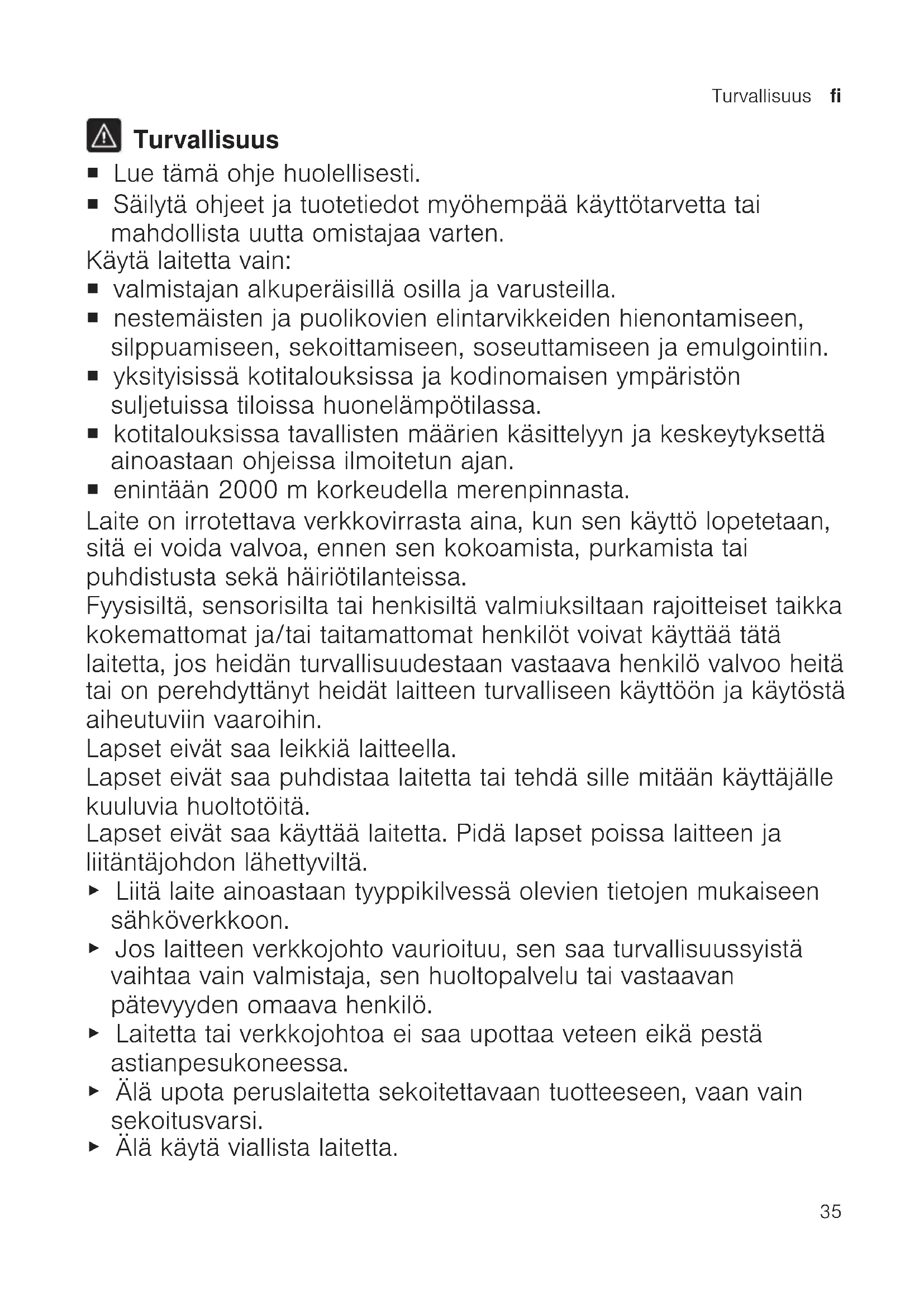 Turvallisuus ¡ Lue tämä ohje huolellisesti. ¡ Säilytä ohjeet ja tuotetiedot myöhempää käyttötarvetta tai mahdollista uutta omistajaa varten. Käytä laitetta vain: ¡ valmistajan alkuperäisillä osilla ja varusteilla. ¡ nestemäisten ja puolikovien elintarvikkeiden hienontamiseen, silppuamiseen, sekoittamiseen, soseuttamiseen ja emulgointiin. ¡ yksityisissä kotitalouksissa ja kodinomaisen ympäristön suljetuissa tiloissa huonelämpötilassa. ¡ kotitalouksissa tavallisten määrien käsittelyyn ja keskeytyksettä ainoastaan ohjeissa ilmoitetun ajan. ¡ enintään 2000m korkeudella merenpinnasta. Laite on irrotettava verkkovirrasta aina, kun sen käyttö lopetetaan, sitä ei voida valvoa, ennen sen kokoamista, purkamista tai puhdistusta sekä häiriötilanteissa. Fyysisiltä, sensorisilta tai henkisiltä valmiuksiltaan rajoitteiset taikka kokemattomat ja/tai taitamattomat henkilöt voivat käyttää tätä laitetta, jos heidän turvallisuudestaan vastaava henkilö valvoo heitä tai on perehdyttänyt heidät laitteen turvalliseen käyttöön ja käytöstä aiheutuviin vaaroihin. Lapset eivät saa leikkiä laitteella. Lapset eivät saa puhdistaa laitetta tai tehdä sille mitään käyttäjälle kuuluvia huoltotöitä. Lapset eivät saa käyttää laitetta. Pidä lapset poissa laitteen ja liitäntäjohdon lähettyviltä. ▶ Liitä laite ainoastaan tyyppikilvessä olevien tietojen mukaiseen sähköverkkoon. ▶ Jos laitteen verkkojohto vaurioituu, sen saa turvallisuussyistä vaihtaa vain valmistaja, sen huoltopalvelu tai vastaavan pätevyyden omaava henkilö. ▶ Laitetta tai verkkojohtoa ei saa upottaa veteen eikä pestä astianpesukoneessa. ▶ Älä upota peruslaitetta sekoitettavaan tuotteeseen, vaan vain sekoitusvarsi. ▶ Älä käytä viallista laitetta.fi Esinevahinkojen välttäminen