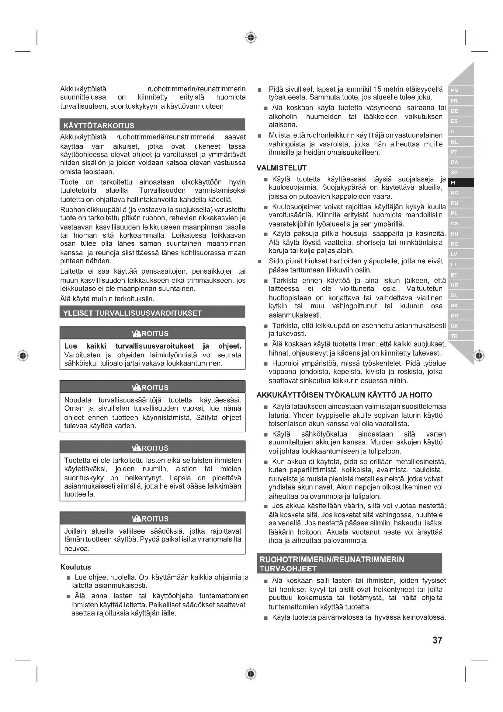 Akkukäyttöistä ruohotrimmeriä/reunatrimmeriä saavat käyttää vain aikuiset, jotka ovat lukeneet tässä käyttöohjeessa olevat ohjeet ja varoitukset ja ymmärtävät niiden sisällön ja joiden voidaan katsoa olevan vastuussa omista teoistaan. Tuote on tarkoitettu ainoastaan ulkokäyttöön hyvin tuuletetuilla alueilla. Turvallisuuden varmistamiseksi tuotetta on ohjattava hallintakahvoilla kahdella kädellä. Ruohonleikkuupäällä (ja vastaavalla suojuksella) varustettu tuote on tarkoitettu pitkän ruohon, rehevien rikkakasvien ja vastaavan kasvillisuuden leikkuuseen maanpinnan tasolla tai hieman sitä korkeammalla. Leikatessa leikkaavan osan tulee olla lähes saman suuntainen maanpinnan kanssa, ja reunoja siistittäessä lähes kohtisuorassa maan pintaan nähden. Laitetta ei saa käyttää pensasaitojen, pensaikkojen tai muun kasvillisuuden leikkaukseen eikä trimmaukseen, jos leikkuutaso ei ole maanpinnan suuntainen. Älä käytä muihin tarkoituksiin. YLEISET TURVALLISUUSVAROITUKSET VAROITUS Lue kaikki turvallisuusvaroitukset ja ohjeet. Varoitusten ja ohjeiden laiminlyönnistä voi seurata sähköisku, tulipalo ja/tai vakava loukkaantuminen. VAROITUS Noudata turvallisuussääntöjä tuotetta käyttäessäsi. Oman ja sivullisten turvallisuuden vuoksi, lue nämä ohjeet ennen tuotteen käynnistämistä. Säilytä ohjeet tulevaa käyttöä varten. VAROITUS Tuotetta ei ole tarkoitettu lasten eikä sellaisten ihmisten käytettäväksi, joiden ruumiin, aistien tai mielen suorituskyky on heikentynyt. Lapsia on pidettävä asianmukaisesti silmällä, jotta he eivät pääse leikkimään tuotteella. VAROITUS Joillain alueilla vallitsee säädöksiä, jotka rajoittavat tämän tuotteen käyttöä. Pyydä paikallisilta viranomaisilta neuvoa. Koulutus ■ Lue ohjeet huolella. Opi käyttämään kaikkia ohjaimia ja laitetta asianmukaisesti. ■ Älä anna lasten tai käyttöohjeita tuntemattomien ihmisten käyttää laitetta. Paikalliset säädökset saattavat asettaa rajoituksia käyttäjän iälle. ■ Pidä sivulliset, lapset ja lemmikit 15 metrin etäisyydellä työalueesta. Sammuta tuote, jos alueelle tulee joku. ■ Älä koskaan käytä tuotetta väsyneenä, sairaana tai alkoholin, huumeiden tai lääkkeiden vaikutuksen alaisena. ■ Muista, että ruohonleikkurin käy t t äjä on vastuunalainen vahingoista ja vaaroista, jotka hän aiheuttaa muille ihmisille ja heidän omaisuuksilleen. VALMISTELUT ■ Käytä tuotetta käyttäessäsi täysiä suojalaseja ja kuulosuojaimia. Suojakypärää on käytettävä alueilla, joissa on putoavien kappaleiden vaara. ■ Kuulosuojaimet voivat rajoittaa käyttäjän kykyä kuulla varoitusääniä. Kiinnitä erityistä huomiota mahdollisiin vaaratekijöihin työalueella ja sen ympärillä. ■ Käytä paksuja pitkiä housuja, saappaita ja käsineitä. Älä käytä löysiä vaatteita, shortseja tai minkäänlaisia koruja tai kulje paljasjaloin. ■ Sido pitkät hiukset hartioiden yläpuolelle, jotta ne eivät pääse tarttumaan liikkuviin osiin. ■ Tarkista ennen käyttöä ja aina iskun jälkeen, että laitteessa ei ole vioittuneita osia. Valtuutetun huoltopisteen on korjattava tai vaihdettava viallinen kytkin tai muu vahingoittunut tai kulunut osa asianmukaisesti. ■ Tarkista, että leikkuupää on asennettu asianmukaisesti ja tukevasti. ■ Älä koskaan käytä tuotetta ilman, että kaikki suojukset, hihnat, ohjauslevyt ja kädensijat on kiinnitetty tukevasti. ■ Huomioi ympäristöä, missä työskentelet. Pidä työalue vapaana johdoista, kepeistä, kivistä ja roskista, jotka saattavat sinkoutua leikkurin osuessa niihin. AKKUKÄYTTÖISEN TYÖKALUN KÄYTTÖ JA HOITO ■ Käytä lataukseen ainoastaan valmistajan suosittelemaa laturia. Yhden tyyppiselle akulle sopivan laturin käyttö toisenlaisen akun kanssa voi olla vaarallista. ■ Käytä sähkötyökalua ainoastaan sitä varten suunniteltujen akkujen kanssa. Muiden akkujen käyttö voi johtaa loukkaantumiseen ja tulipaloon. ■ Kun akkua ei käytetä, pidä se erillään metalliesineistä, kuten paperiliittimistä, kolikoista, avaimista, nauloista, ruuveista ja muista pienistä metalliesineistä, jotka voivat yhdistää akun navat. Akun napojen oikosulkeminen voi aiheuttaa palovammoja ja tulipalon. ■ Jos akkua käsitellään väärin, siitä voi vuotaa nestettä; älä kosketa sitä. Jos kosketat sitä vahingossa, huuhtele se vedellä. Jos nestettä pääsee silmiin, hakeudu lisäksi lääkärin hoitoon. Akusta vuotanut neste voi ärsyttää ihoa ja aiheuttaa palovammoja. RUOHOTRIMMERIN/REUNATRIMMERIN TURVAOHJEET ■ Älä koskaan salli lasten tai ihmisten, joiden fyysiset tai henkiset kyvyt tai aistit ovat heikentyneet tai joilta puuttuu kokemusta tai tietämystä, tai näitä ohjeita tuntemattomien käyttää tuotetta. ■ Käytä tuotetta päivänvalossa tai hyvässä keinovalossa.38 | Suomi ■ Vältä käyttöä märällä ruoholla. ■ Säilytä aina kunnollinen jalansija ja tasapaino, erityisesti rinteissä. ■ Älä kävele takaperin tuotetta käyttäessäsi. ■ Kävele, älä koskaan juokse. ■ Pidä leikkuupää pää vyötärön alapuolella. ■ Älä koskaan käytä tuotetta, jos sen suojukset ovat vioittuneita tai puuttuvat. ■ Älä koskaan asenna metallista varasiimaa. ■ Pidä kädet ja jalat hyvin kaukana terästä koko ajan, varsinkin konetta käynnistäessä. ■ Varo – leikkuuelementit jatkavat pyörimistä moottorin sammuttamisen jälkeen. ■ Varo leikkuusiiman sinkoamia kappaleita. Siivoa työalueelta roskat, kuten pienet kivet, sora ja muut vieraskappaleet, ennen käytön aloittamista. Leikkuulaitteeseen voi tarttua johtoja tai lankoja. ■ Sammuta laite ja irrota akku ennen seuraavia: ● huolto ● tuotteen jättäminen valvomatta ● Laitteen puhdistaminen ● lisävarusteiden vaihtaminen ● vaurioiden tarkistaminen esineeseen osumisen jälkeen ● vaurioiden tarkistaminen, jos tuote alkaa täristä epänormaalisti ● huolto ■ Käytä tuotetta k