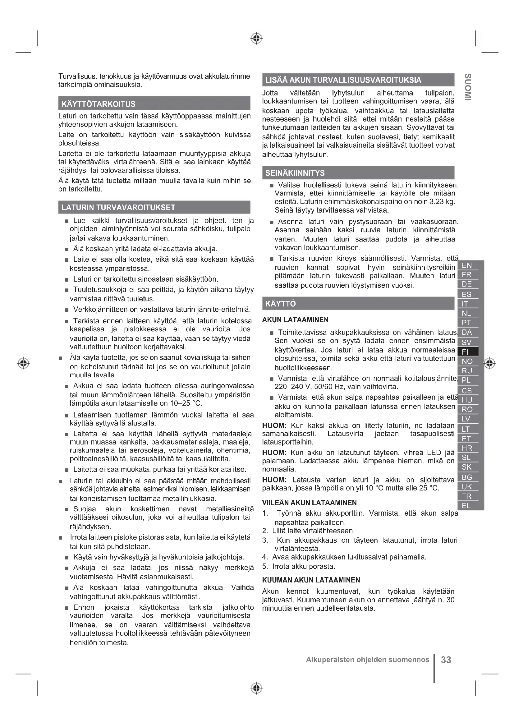 Laturi on tarkoitettu vain tässä käyttöoppaassa mainittujen yhteensopivien akkujen lataamiseen. Laite on tarkoitettu käyttöön vain sisäkäyttöön kuivissa olosuhteissa. Laitetta ei ole tarkoitettu lataamaan muuntyyppisiä akkuja tai käytettäväksi virtalähteenä. Sitä ei saa lainkaan käyttää räjähdys- tai palovaarallisissa tiloissa. Älä käytä tätä tuotetta millään muulla tavalla kuin mihin se on tarkoitettu. LATURIN TURVAVAROITUKSET ■ Lue kaikki turvallisuusvaroitukset ja ohjeet. ten ja ohjeiden laiminlyönnistä voi seurata sähköisku, tulipalo ja/tai vakava loukkaantuminen. ■ Älä koskaan yritä ladata ei-ladattavia akkuja. ■ Laite ei saa olla kostea, eikä sitä saa koskaan käyttää kosteassa ympäristössä. ■ Laturi on tarkoitettu ainoastaan sisäkäyttöön. ■ Tuuletusaukkoja ei saa peittää, ja käytön aikana täytyy varmistaa riittävä tuuletus. ■ Verkkojännitteen on vastattava laturin jännite-eritelmiä. ■ Tarkista ennen laitteen käyttöä, että laturin kotelossa, kaapelissa ja pistokkeessa ei ole vaurioita. Jos vaurioita on, laitetta ei saa käyttää, vaan se täytyy viedä valtuutettuun huoltoon korjattavaksi. ■ Älä käytä tuotetta, jos se on saanut kovia iskuja tai siihen on kohdistunut tärinää tai jos se on vaurioitunut jollain muulla tavalla. ■ Akkua ei saa ladata tuotteen ollessa auringonvalossa tai muun lämmönlähteen lähellä. Suositeltu ympäristön lämpötila akun lataamiselle on 10–25 °C. ■ Lataamisen tuottaman lämmön vuoksi laitetta ei saa käyttää syttyvällä alustalla. ■ Laitetta ei saa käyttää lähellä syttyviä materiaaleja, muun muassa kankaita, pakkausmateriaaleja, maaleja, ruiskumaaleja tai aerosoleja, voiteluaineita, ohentimia, polttoainesäiliöitä, kaasusäiliöitä tai kaasulaitteita. ■ Laitetta ei saa muokata, purkaa tai yrittää korjata itse. ■ Laturiin tai akkuihin ei saa päästää mitään mahdollisesti sähköä johtavia aineita, esimerkiksi hiomisen, leikkaamisen tai koneistamisen tuottamaa metallihiukkasia. ■ Suojaa akun koskettimen navat metalliesineiltä välttääksesi oikosulun, joka voi aiheuttaa tulipalon tai räjähdyksen. ■ Irrota laitteen pistoke pistorasiasta, kun laitetta ei käytetä tai kun sitä puhdistetaan. ■ Käytä vain hyväksyttyjä ja hyväkuntoisia jatkojohtoja. ■ Akkuja ei saa ladata, jos niissä näkyy merkkejä vuotamisesta. Hävitä asianmukaisesti. ■ Älä koskaan lataa vahingoittunutta akkua. Vaihda vahingoittunut akkupakkaus välittömästi. ■ Ennen jokaista käyttökertaa tarkista jatkojohto vaurioiden varalta. Jos merkkejä vaurioitumisesta ilmenee, se on vaaran välttämiseksi vaihdettava valtuutetussa huoltoliikkeessä tehtävään pätevöityneen henkilön toimesta.