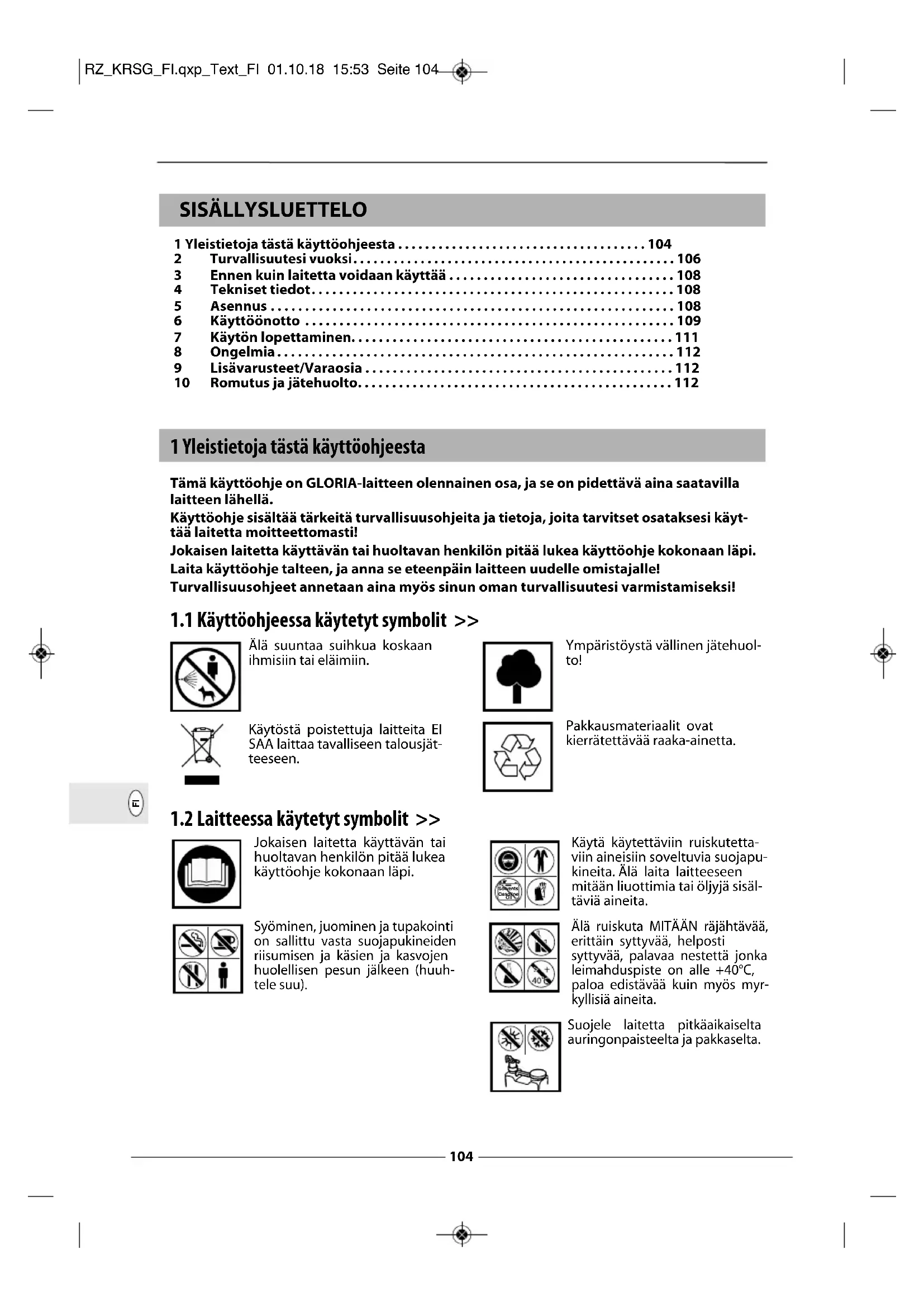 Romutus ja jätehuolto. . . . . . . . . . . . . . . . . . . . . . . . . . . . . . . . . . . . . . . . . . . . . . 112 1 Yleistietoja tästä käyttöohjeesta Tämä käyttöohje on GLORIA-laitteen olennainen osa, ja se on pidettävä aina saatavilla laitteen lähellä. Käyttöohje sisältää tärkeitä turvallisuusohjeita ja tietoja, joita tarvitset osataksesi käyt- tää laitetta moitteettomasti! Jokaisen laitetta käyttävän tai huoltavan henkilön pitää lukea käyttöohje kokonaan läpi. Laita käyttöohje talteen, ja anna se eteenpäin laitteen uudelle omistajalle! Turvallisuusohjeet annetaan aina myös sinun oman turvallisuutesi varmistamiseksi!