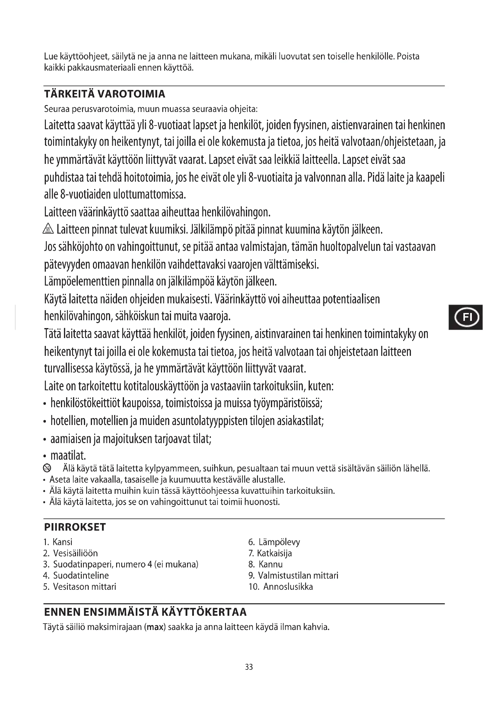 Seuraa perusvarotoimia, muun muassa seuraavia ohjeita: Laitetta saavat käyttää yli 8-vuotiaat lapset ja henkilöt, joiden fyysinen, aistienvarainen tai henkinen toimintakyky on heikentynyt, tai joilla ei ole kokemusta ja tietoa, jos heitä valvotaan/ohjeistetaan, ja he ymmärtävät käyttöön liittyvät vaarat. Lapset eivät saa leikkiä laitteella. Lapset eivät saa puhdistaa tai tehdä hoitotoimia, jos he eivät ole yli 8-vuotiaita ja valvonnan alla. Pidä laite ja kaapeli alle 8-vuotiaiden ulottumattomissa. Laitteen väärinkäyttö saattaa aiheuttaa henkilövahingon. h Laitteen pinnat tulevat kuumiksi. Jälkilämpö pitää pinnat kuumina käytön jälkeen. Jos sähköjohto on vahingoittunut, se pitää antaa valmistajan, tämän huoltopalvelun tai vastaavan pätevyyden omaavan henkilön vaihdettavaksi vaarojen välttämiseksi. Lämpöelementtien pinnalla on jälkilämpöä käytön jälkeen. Käytä laitetta näiden ohjeiden mukaisesti. Väärinkäyttö voi aiheuttaa potentiaalisen henkilövahingon, sähköiskun tai muita vaaroja. Tätä laitetta saavat käyttää henkilöt, joiden fyysinen, aistinvarainen tai henkinen toimintakyky on heikentynyt tai joilla ei ole kokemusta tai tietoa, jos heitä valvotaan tai ohjeistetaan laitteen turvallisessa käytössä, ja he ymmärtävät käyttöön liittyvät vaarat. Laite on tarkoitettu kotitalouskäyttöön ja vastaaviin tarkoituksiin, kuten: