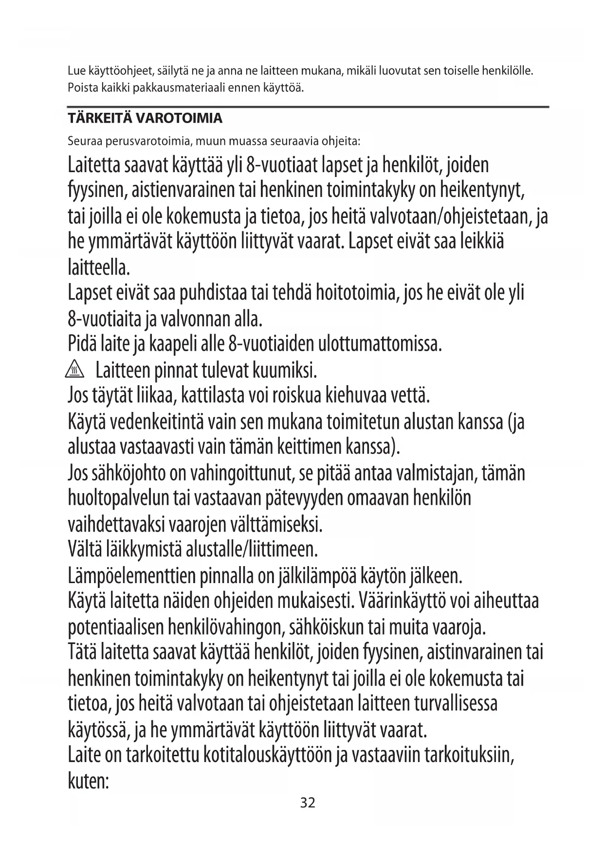 Seuraa perusvarotoimia, muun muassa seuraavia ohjeita: Laitetta saavat käyttää yli 8-vuotiaat lapset ja henkilöt, joiden fyysinen, aistienvarainen tai henkinen toimintakyky on heikentynyt, tai joilla ei ole kokemusta ja tietoa, jos heitä valvotaan/ohjeistetaan, ja he ymmärtävät käyttöön liittyvät vaarat. Lapset eivät saa leikkiä laitteella. Lapset eivät saa puhdistaa tai tehdä hoitotoimia, jos he eivät ole yli 8-vuotiaita ja valvonnan alla. Pidä laite ja kaapeli alle 8-vuotiaiden ulottumattomissa. h Laitteen pinnat tulevat kuumiksi. Jos täytät liikaa, kattilasta voi roiskua kiehuvaa vettä. Käytä vedenkeitintä vain sen mukana toimitetun alustan kanssa (ja alustaa vastaavasti vain tämän keittimen kanssa). Jos sähköjohto on vahingoittunut, se pitää antaa valmistajan, tämän huoltopalvelun tai vastaavan pätevyyden omaavan henkilön vaihdettavaksi vaarojen välttämiseksi. Vältä läikkymistä alustalle/liittimeen. Lämpöelementtien pinnalla on jälkilämpöä käytön jälkeen. Käytä laitetta näiden ohjeiden mukaisesti. Väärinkäyttö voi aiheuttaa potentiaalisen henkilövahingon, sähköiskun tai muita vaaroja. Tätä laitetta saavat käyttää henkilöt, joiden fyysinen, aistinvarainen tai henkinen toimintakyky on heikentynyt tai joilla ei ole kokemusta tai tietoa, jos heitä valvotaan tai ohjeistetaan laitteen turvallisessa käytössä, ja he ymmärtävät käyttöön liittyvät vaarat. Laite on tarkoitettu kotitalouskäyttöön ja vastaaviin tarkoituksiin, kuten:33