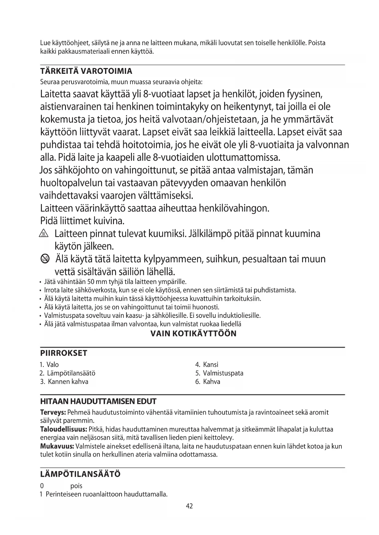 Seuraa perusvarotoimia, muun muassa seuraavia ohjeita: Laitetta saavat käyttää yli 8-vuotiaat lapset ja henkilöt, joiden fyysinen, aistienvarainen tai henkinen toimintakyky on heikentynyt, tai joilla ei ole kokemusta ja tietoa, jos heitä valvotaan/ohjeistetaan, ja he ymmärtävät käyttöön liittyvät vaarat. Lapset eivät saa leikkiä laitteella. Lapset eivät saa puhdistaa tai tehdä hoitotoimia, jos he eivät ole yli 8-vuotiaita ja valvonnan alla. Pidä laite ja kaapeli alle 8-vuotiaiden ulottumattomissa. Jos sähköjohto on vahingoittunut, se pitää antaa valmistajan, tämän huoltopalvelun tai vastaavan pätevyyden omaavan henkilön vaihdettavaksi vaarojen välttämiseksi. Laitteen väärinkäyttö saattaa aiheuttaa henkilövahingon. Pidä liittimet kuivina.