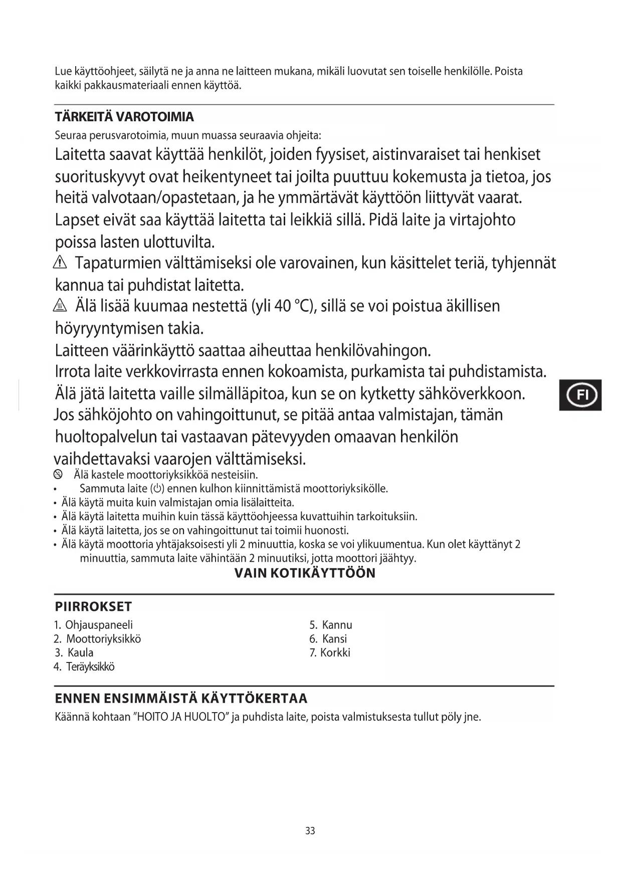 Seuraa perusvarotoimia, muun muassa seuraavia ohjeita: Laitetta saavat käyttää henkilöt, joiden fyysiset, aistinvaraiset tai henkiset suorituskyvyt ovat heikentyneet tai joilta puuttuu kokemusta ja tietoa, jos heitä valvotaan/opastetaan, ja he ymmärtävät käyttöön liittyvät vaarat. Lapset eivät saa käyttää laitetta tai leikkiä sillä. Pidä laite ja virtajohto poissa lasten ulottuvilta. c Tapaturmien välttämiseksi ole varovainen, kun käsittelet teriä, tyhjennät kannua tai puhdistat laitetta. h Älä lisää kuumaa nestettä (yli 40 °C), sillä se voi poistua äkillisen höyryyntymisen takia. Laitteen väärinkäyttö saattaa aiheuttaa henkilövahingon. Irrota laite verkkovirrasta ennen kokoamista, purkamista tai puhdistamista. Älä jätä laitetta vaille silmälläpitoa, kun se on kytketty sähköverkkoon. Jos sähköjohto on vahingoittunut, se pitää antaa valmistajan, tämän huoltopalvelun tai vastaavan pätevyyden omaavan henkilön vaihdettavaksi vaarojen välttämiseksi. l Älä kastele moottoriyksikköä nesteisiin.