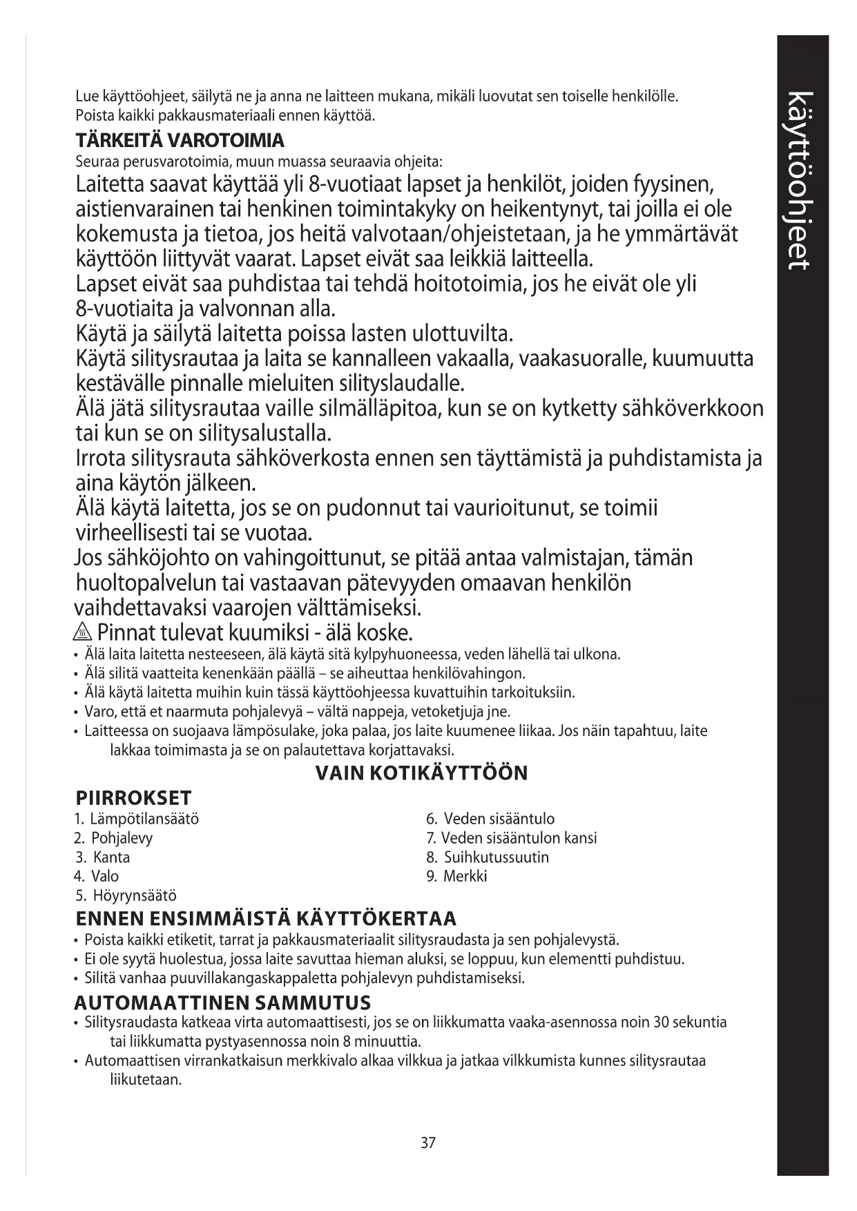 Seuraa perusvarotoimia, muun muassa seuraavia ohjeita: Laitetta saavat käyttää yli 8-vuotiaat lapset ja henkilöt, joiden fyysinen, aistienvarainen tai henkinen toimintakyky on heikentynyt, tai joilla ei ole kokemusta ja tietoa, jos heitä valvotaan/ohjeistetaan, ja he ymmärtävät käyttöön liittyvät vaarat. Lapset eivät saa leikkiä laitteella. Lapset eivät saa puhdistaa tai tehdä hoitotoimia, jos he eivät ole yli 8-vuotiaita ja valvonnan alla. Käytä ja säilytä laitetta poissa lasten ulottuvilta. Käytä silitysrautaa ja laita se kannalleen vakaalla, vaakasuoralle, kuumuutta kestävälle pinnalle mieluiten silityslaudalle. Älä jätä silitysrautaa vaille silmälläpitoa, kun se on kytketty sähköverkkoon tai kun se on silitysalustalla. Irrota silitysrauta sähköverkosta ennen sen täyttämistä ja puhdistamista ja aina käytön jälkeen. Älä käytä laitetta, jos se on pudonnut tai vaurioitunut, se toimii virheellisesti tai se vuotaa. Jos sähköjohto on vahingoittunut, se pitää antaa valmistajan, tämän huoltopalvelun tai vastaavan pätevyyden omaavan henkilön vaihdettavaksi vaarojen välttämiseksi. h Pinnat tulevat kuumiksi - älä koske.