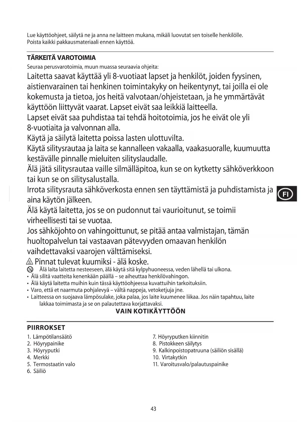 Seuraa perusvarotoimia, muun muassa seuraavia ohjeita: Laitetta saavat käyttää yli 8-vuotiaat lapset ja henkilöt, joiden fyysinen, aistienvarainen tai henkinen toimintakyky on heikentynyt, tai joilla ei ole kokemusta ja tietoa, jos heitä valvotaan/ohjeistetaan, ja he ymmärtävät käyttöön liittyvät vaarat. Lapset eivät saa leikkiä laitteella. Lapset eivät saa puhdistaa tai tehdä hoitotoimia, jos he eivät ole yli 8-vuotiaita ja valvonnan alla. Käytä ja säilytä laitetta poissa lasten ulottuvilta. Käytä silitysrautaa ja laita se kannalleen vakaalla, vaakasuoralle, kuumuutta kestävälle pinnalle mieluiten silityslaudalle. Älä jätä silitysrautaa vaille silmälläpitoa, kun se on kytketty sähköverkkoon tai kun se on silitysalustalla. Irrota silitysrauta sähköverkosta ennen sen täyttämistä ja puhdistamista ja aina käytön jälkeen. Älä käytä laitetta, jos se on pudonnut tai vaurioitunut, se toimii virheellisesti tai se vuotaa. Jos sähköjohto on vahingoittunut, se pitää antaa valmistajan, tämän huoltopalvelun tai vastaavan pätevyyden omaavan henkilön vaihdettavaksi vaarojen välttämiseksi. h Pinnat tulevat kuumiksi - älä koske.