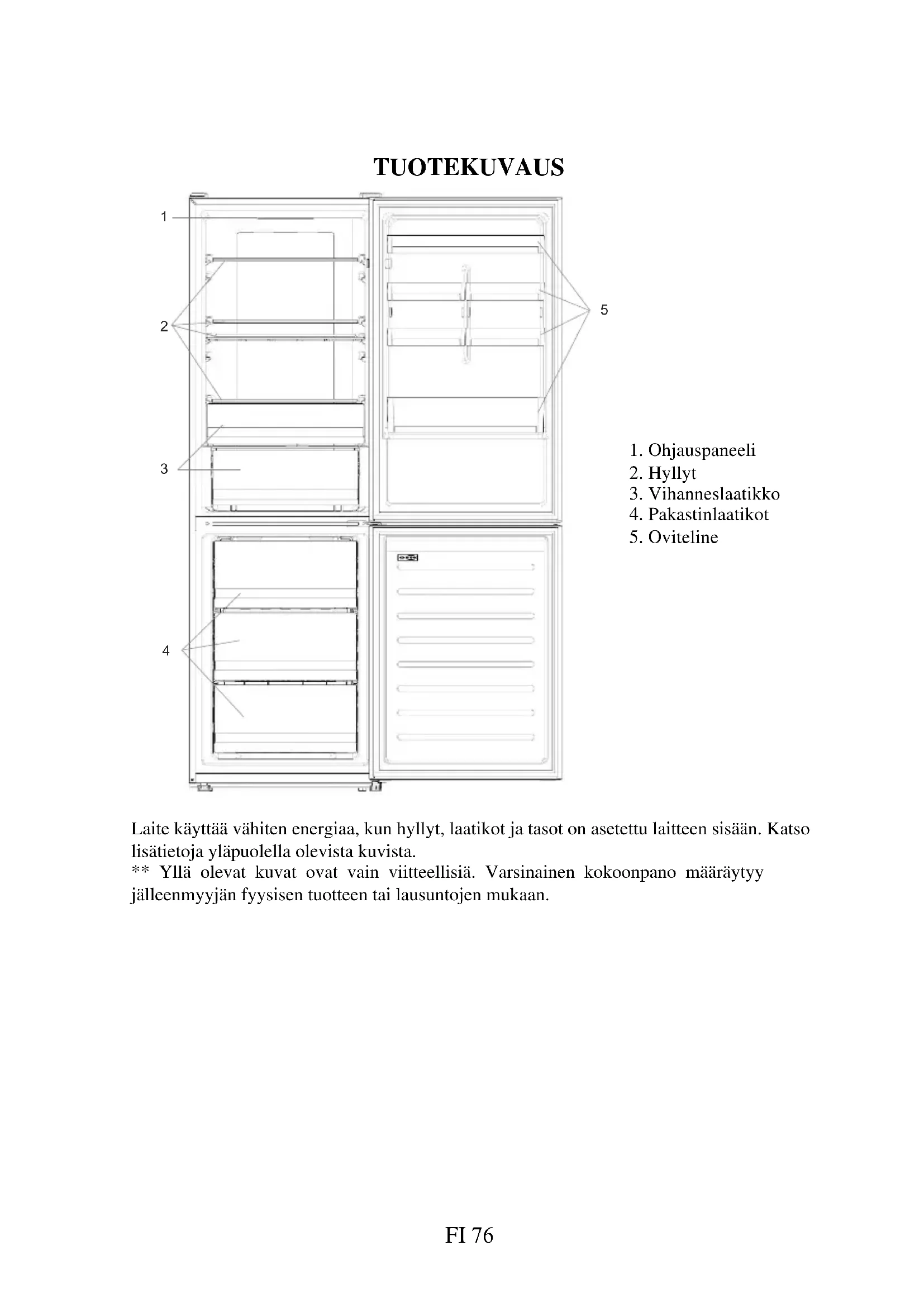 Laite käyttää vähiten energiaa, kun hyllyt, laatikot ja tasot on asetettu laitteen sisään. Katso lisätietoja yläpuolella olevista kuvista. ** Yllä olevat kuvat ovat vain viitteellisiä. Varsinainen kokoonpano määräytyy jälleenmyyjän fyysisen tuotteen tai lausuntojen mukaan.