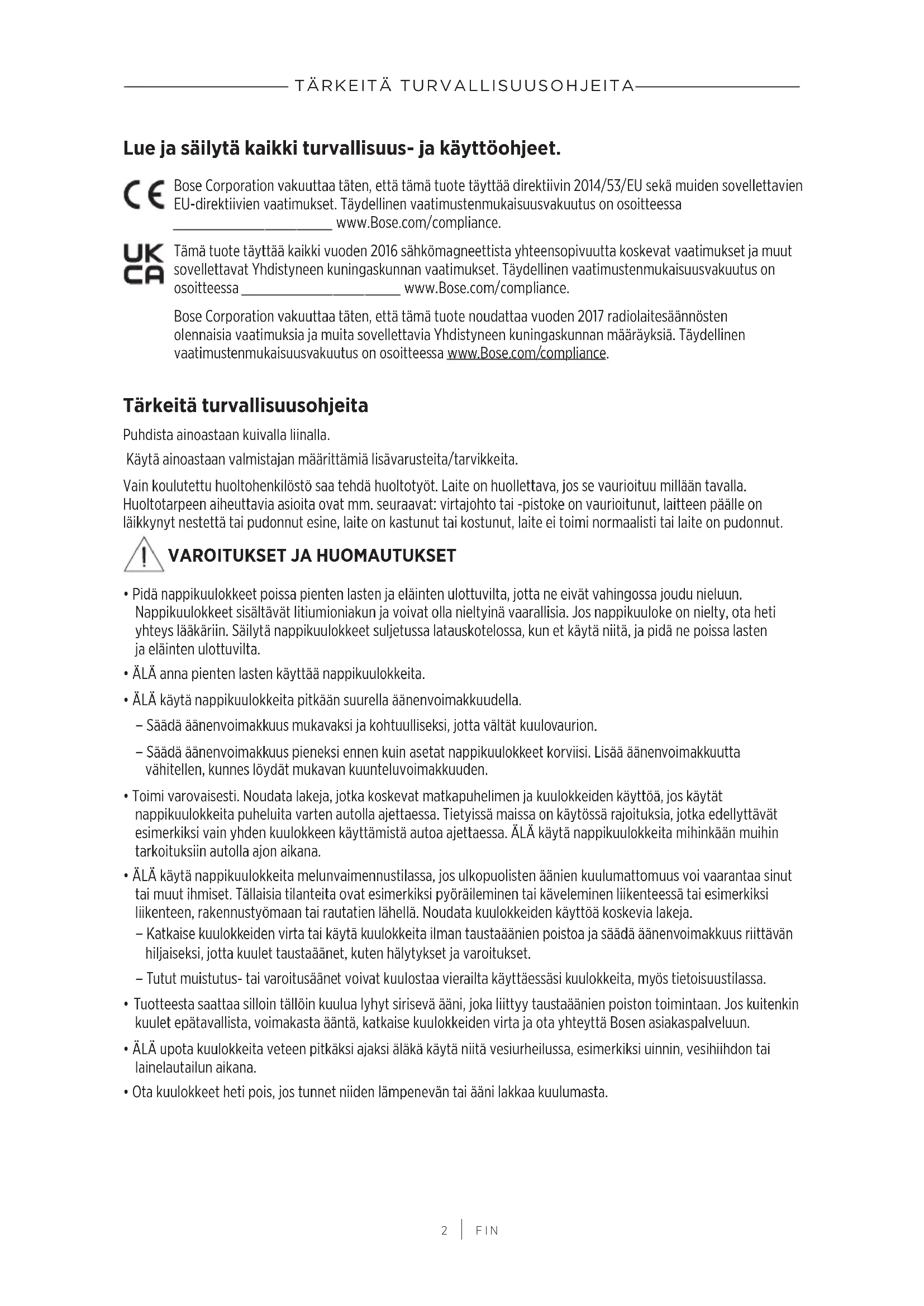 Bose Corporation vakuuttaa taten, etta tamä tuote noudattaa vuoden 2017 radiolaitesaannösten olennaisia vaatimuksa ja muita sovellettavia Yhdistyneen kuningaskunnan maärayksiä. Täydellinen vaatimustemmukaisuusvakuutus on osoitteessa www.Bose.com/compliance.