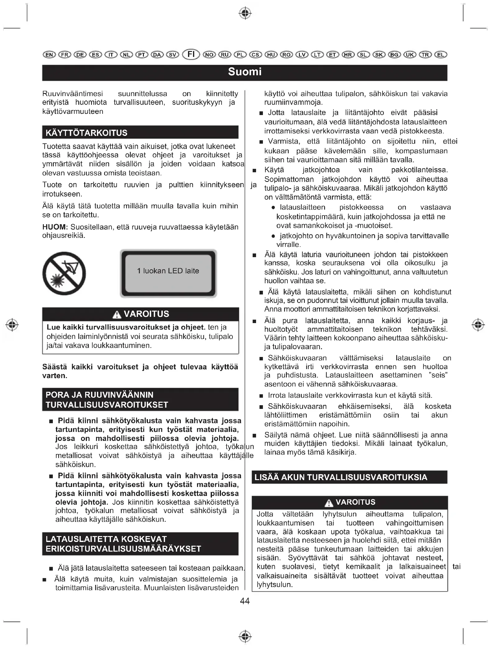 EN FR DE ES IT NL PT DA SV NO RU PL CS HU RO LV LT ET HR SL SK UKBG TR EL Suomi Ruuvinvääntimesi suunnittelussa on kiinnitetty HULW\LVWl KXRPLRWD WXUYDOOLVXXWHHQ VXRULWXVN\N\\Q MD käyttövarmuuteen