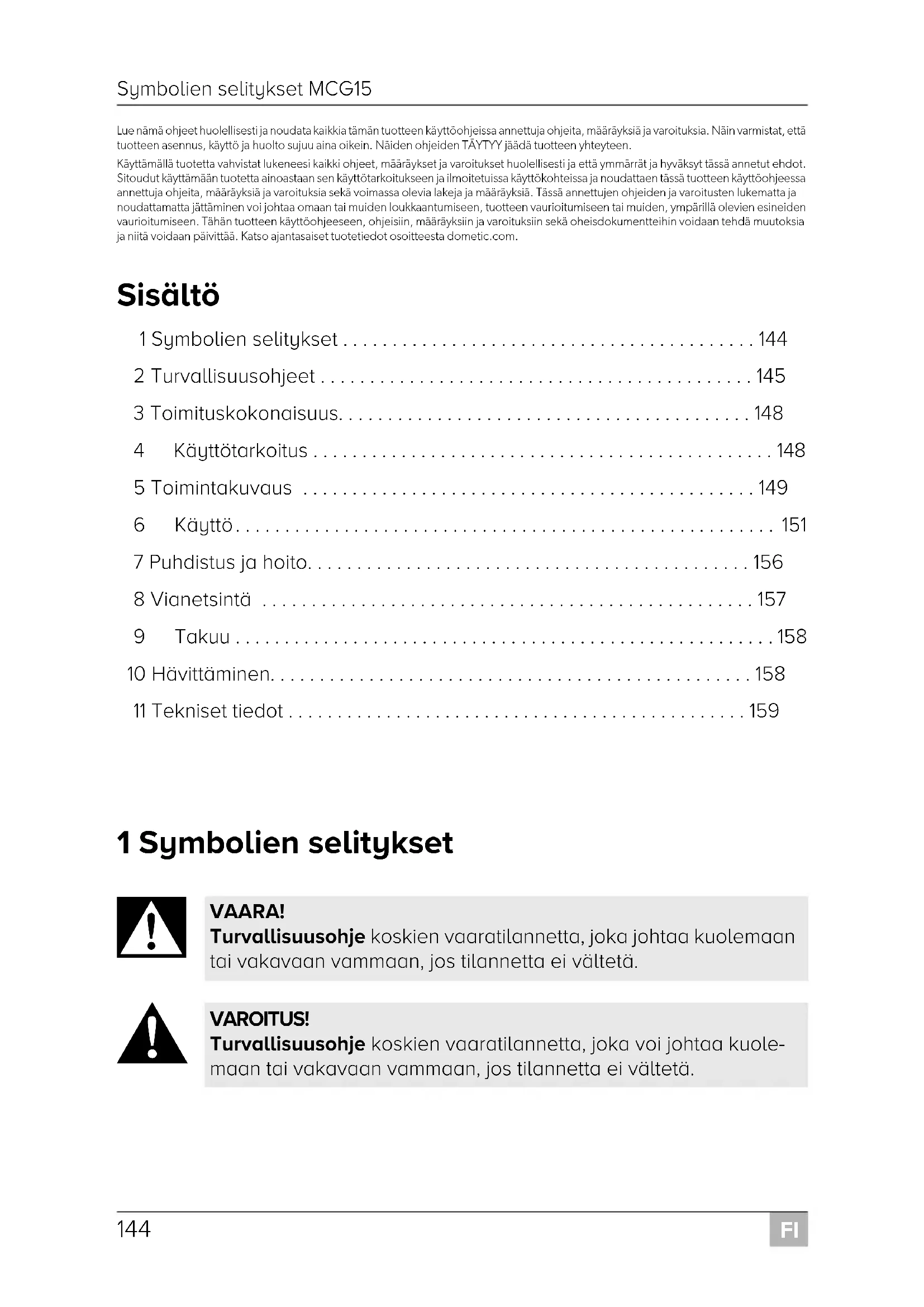 - Lue nämä ohjeet huolellisesti ja noudata kaikkia tämän tuotteen käyttöohjeissa annettuja ohjeita, määräyksiä ja varoituksia. Näin varmistat, että tuotteen asennus, käyttö ja huolto sujuu aina oikein. Näiden ohjeiden TÄYTYY jäädä tuotteen yhteyteen. Käyttämällä tuotetta vahvistat lukeneesi kaikki ohjeet, määräykset ja varoitukset huolellisesti ja että ymmärrät ja hyväksyt tässä annetut ehdot. Sitoudut käyttämään tuotetta ainoastaan sen käyttötarkoitukseen ja ilmoitetuissa käyttökohteissa ja noudattaen tässä tuotteen käyttöohjeessa annettuja ohjeita, määräyksiä ja varoituksia sekä voimassa olevia lakeja ja määräyksiä. Tässä annettujen ohjeiden ja varoitusten lukematta ja noudattamatta jättäminen voi johtaa omaan tai muiden loukkaantumiseen, tuotteen vaurioitumiseen tai muiden, ympärillä olevien esineiden vaurioitumiseen. Tähän tuotteen käyttöohjeeseen, ohjeisiin, määräyksiin ja varoituksiin sekä oheisdokumentteihin voidaan tehdä muutoksia ja niitä voidaan päivittää. Katso ajantasaiset tuotetiedot osoitteesta dometic.com. Sisältö 1 Symbolien selitykset p. 144