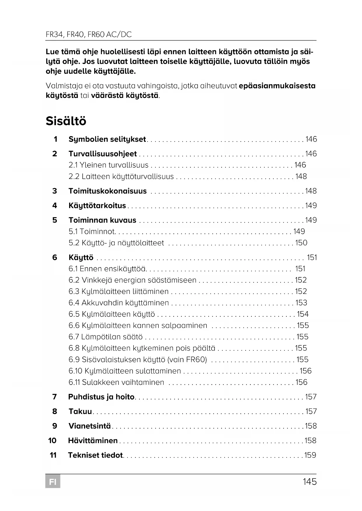 HUOMAUTUS! Älä käytä kylmälaukun sisällä mitään sähkölaitteita, vaikka valmistaja näitä suosittelisikin. Älkää asettako laitetta avoliekkien tai muiden lämpölähteiden (lämmitys, voimakas auringonpaiste, kaasu-uunit jne.) lähelle. Ylikuumenemisvaara! Huolehtikaa aina siitä, käytössä syntyvä lämpö saadaan johdettua riittävän hyvin pois. Huolehtikaa siitä, että laite on riittävän etäällä seinistä tai esineistä, jotta ilma pääsee kiertämään. Huolehtikaa siitä, että tuuletusrakoja ei peitetä. Älkää laittako sisäastiaan minkäänlaisia nesteitä tai jäätä. Älkää upottako laitetta koskaan veteen. Suojatkaa laite ja sen johto kuumuudelta ja kosteudelta. 3 Toimituskokonaisuus Määrä Kuvaus1 Kompressorikylmälaatikko1 Tasavirtaliitäntäjohto1 Vaihtovirtaliitäntäjohto1 Käyttöohje FR34-FR40-FR60--O-16s.book Seite 148 Donnerstag, 19. Juli 2018 3:22 15FI FR34, FR40, FR60 AC/DC Käyttötarkoitus