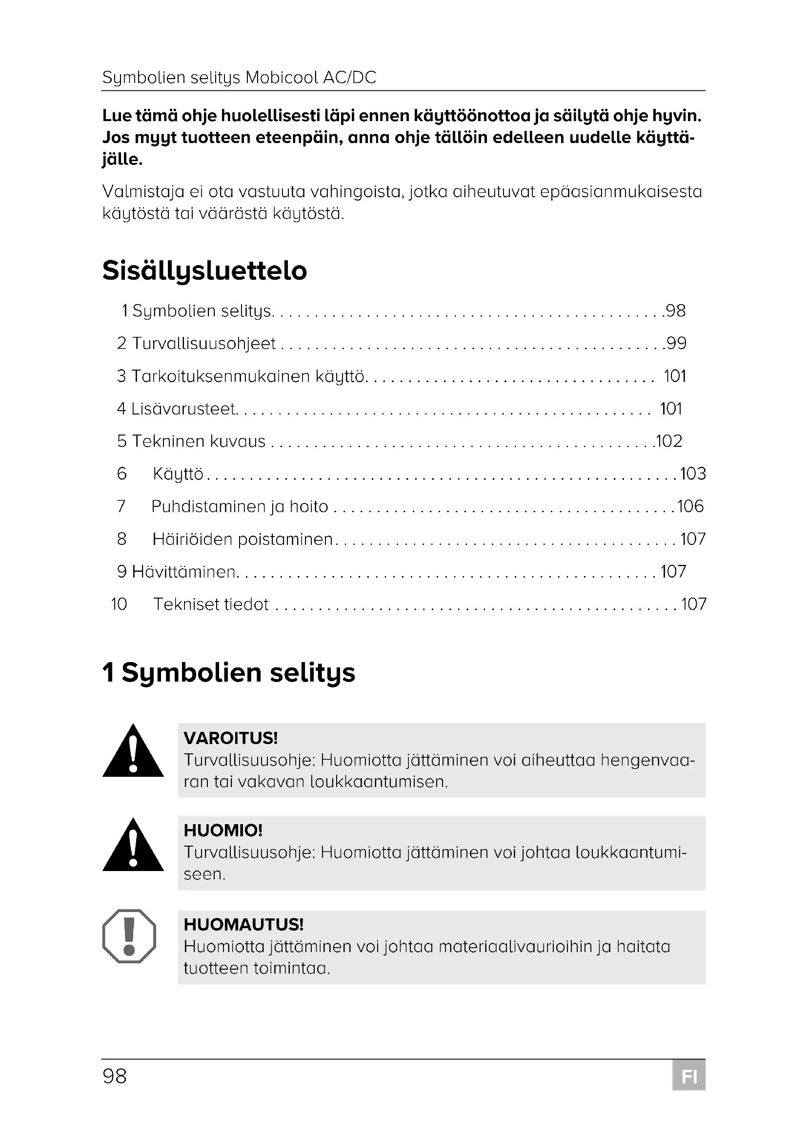 VAROITUS! Turvallisuusohje: Huomiotta jättäminen voi aiheuttaa hengenvaa- ran tai vakavan loukkaantumisen. HUOMIO! Turvallisuusohje: Huomiotta jättäminen voi johtaa loukkaantumi- seen. HUOMAUTUS! Huomiotta jättäminen voi johtaa materiaalivaurioihin ja haitata tuotteen toimintaa. Mobicool-AC-DC--O-16s.book Seite 98 Montag, 8. Januar 2018 6:11 18FI Mobicool AC/DC Turvallisuusohjeet