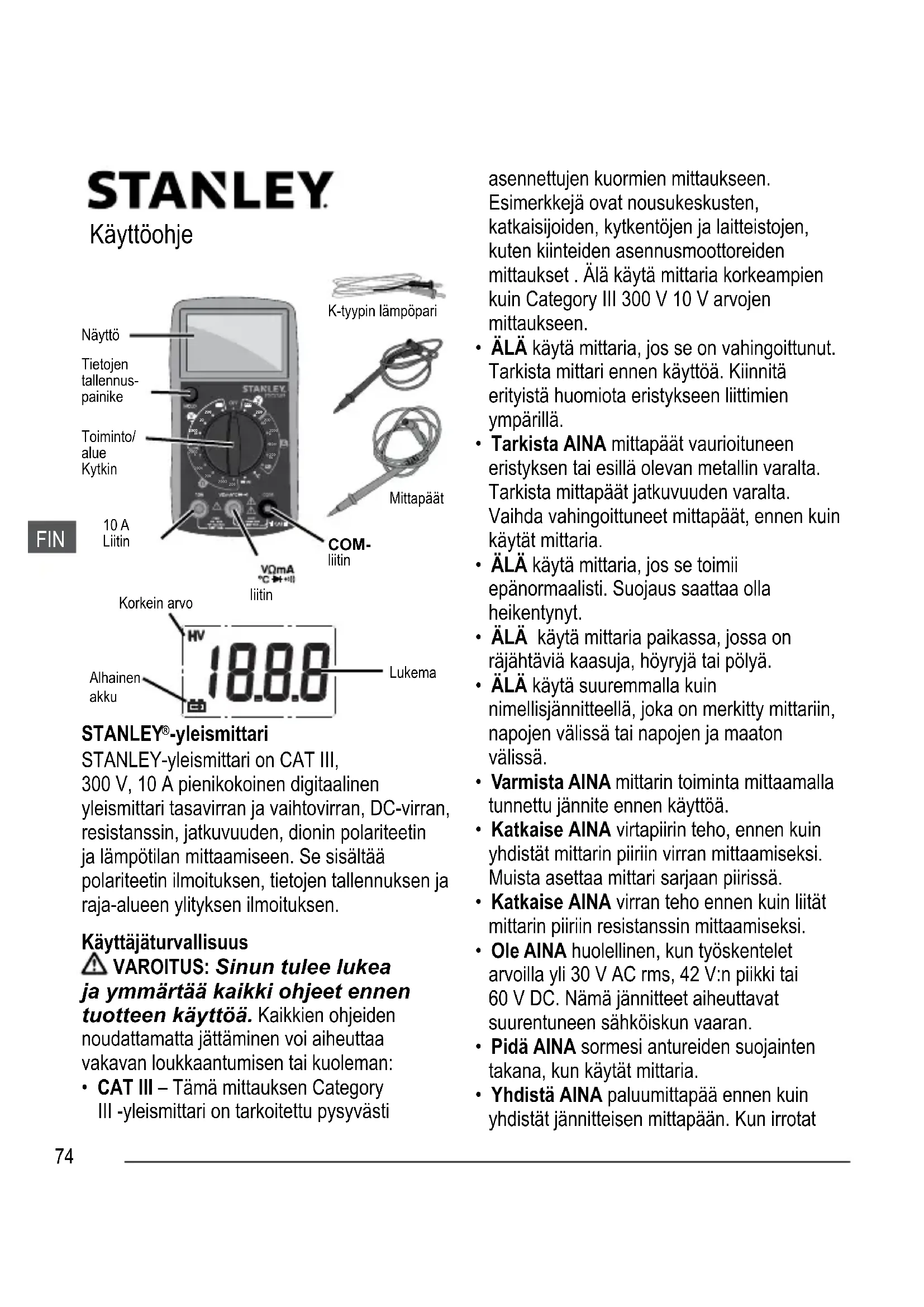STANLEY-yleismittari on CAT III, 300 V, 10 A pienikokoinen digitaalinen yleismittari tasavirran ja vaihtovirran, DC-virran, resistanssin, jatkuvuuden, dionin polariteetin ja lampotilan mittaamiseen. Se sisaltaa polariteetin ilmoituksen, tietojen tallennuksen ja raja-alueen ylityksen ilmoituksen.