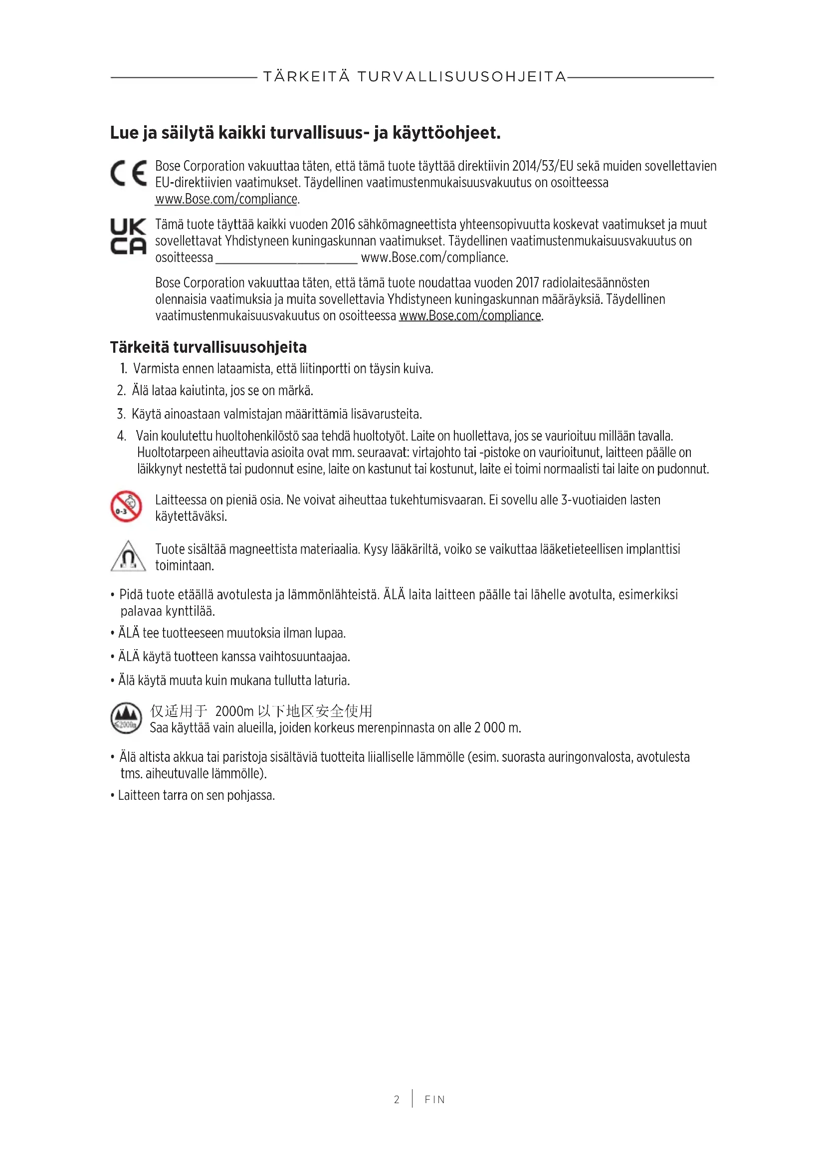 FIN Lue ja säilytä kaikki turvallisuus- ja käyttöohjeet. Bose Corporation vakuuttaa täten, että tämä tuote täyttää direktiivin 2014/53/EU sekä muiden sovellettavien EU-direktiivien vaatimukset. Täydellinen vaatimustenmukaisuusvakuutus on osoitteessa www.Bose.com/compliancewww.Bose.com/compliance.. Tämä tuote täyttää kaikki vuoden2016 sähkömagneettista yhteensopivuutta koskevat vaatimukset ja muut sovellettavat Yhdistyneen kuningaskunnan vaatimukset. Täydellinen vaatimustenmukaisuusvakuutus on osoitteessa www.Bose.com/compliancewww.Bose.com/compliance. Bose Corporation vakuuttaa täten, että tämä tuote noudattaa vuoden2017 radiolaitesäännösten olennaisia vaatimuksia ja muita sovellettavia Yhdistyneen kuningaskunnan määräyksiä. Täydellinen vaatimustenmukaisuusvakuutus on osoitteessa www.Bose.com/compliancewww.Bose.com/compliance.. Tärkeitä turvallisuusohjeita