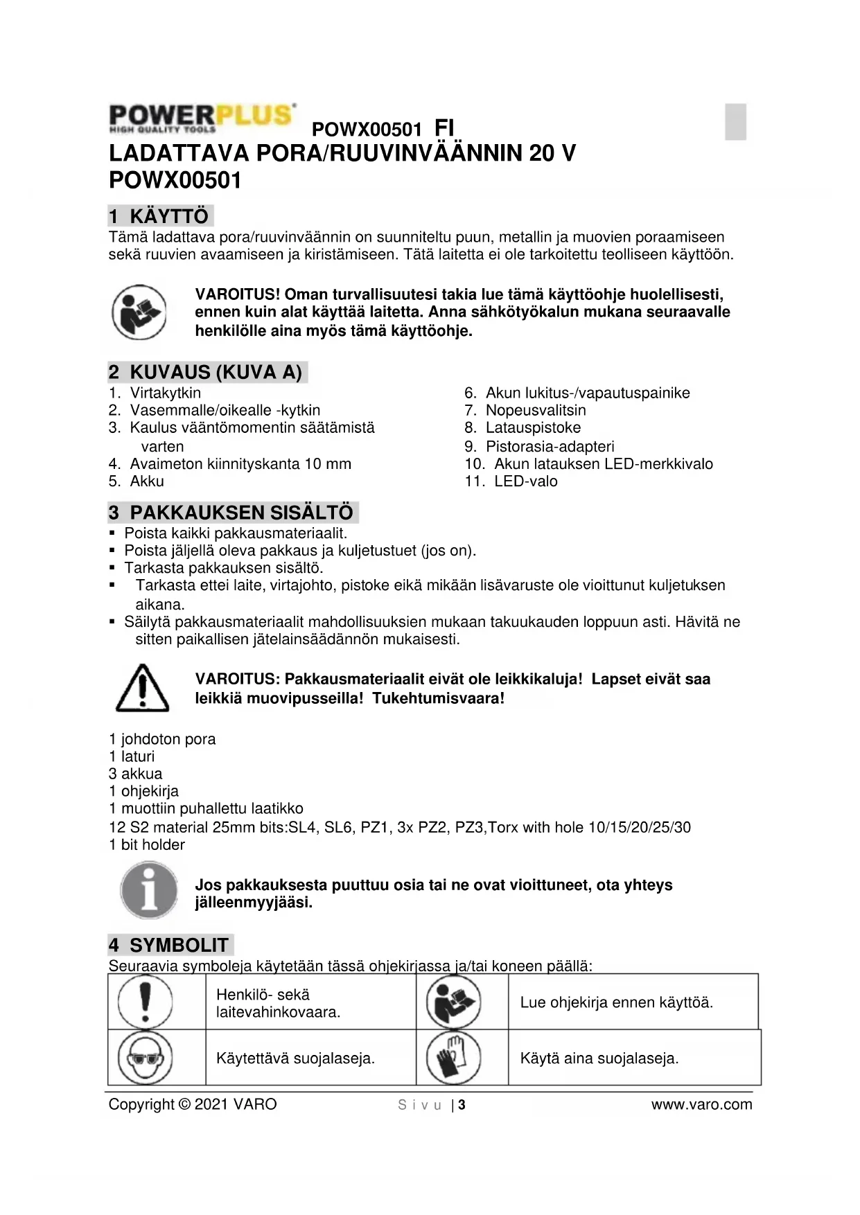 Käytä aina suojalaseja.POWX00501 FI Copyright © 2021 VARO S i v u | 4 www.varo.com