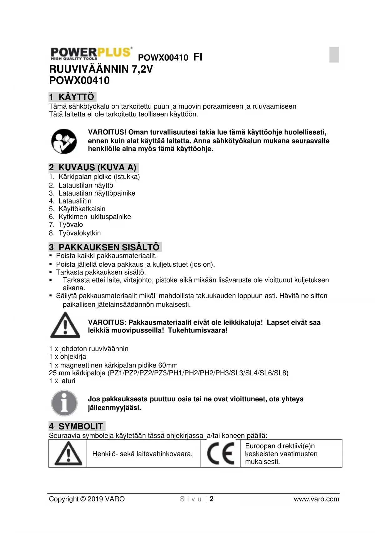 Euroopan direktiivi(e)n keskeisten vaatimusten mukaisesti.POWX00410 FI Copyright © 2019 VARO S i v u | 3 www.varo.com