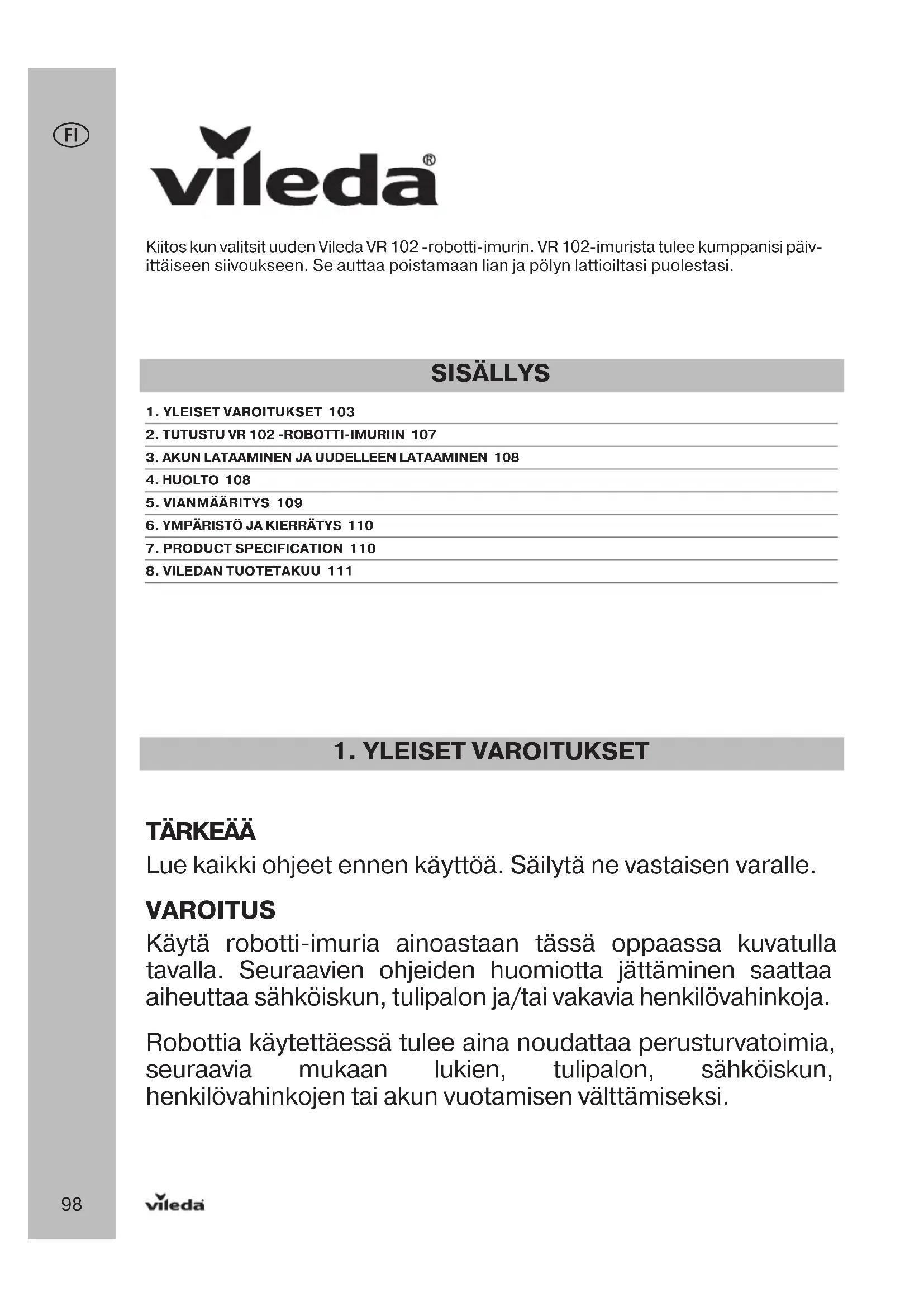 TÄRKEÄÄ Lue kaikki ohjeet ennen käyttöä. Säilytä ne vastaisen varalle. VAROITUS Käytä robotti-imuria ainoastaan tässä oppaassa kuvatulla tavalla. Seuraavien ohjeiden huomiotta jättäminen saattaa aiheuttaa sähköiskun, tulipalon ja/tai vakavia henkilövahinkoja. Robottia käytettäessä tulee aina noudattaa perusturvatoimia, seuraavia mukaan lukien, tulipalon, sähköiskun, henkilövahinkojen tai akun vuotamisen välttämiseksi. Kiitos kun valitsit uuden Vileda VR 102 -robotti-imurin. VR 102-imurista tulee kumppanisi päiv- ittäiseen siivoukseen. Se auttaa poistamaan lian ja pölyn lattioiltasi puolestasi. SISÄLLYS 1. YLEISET VAROITUKSET 1032. TUTUSTU VR 102 -ROBOTTI-IMURIIN 1073. AKUN LATAAMINEN JA UUDELLEEN LATAAMINEN 1084. HUOLTO 1085. VIANMÄÄRITYS 1096. YMPÄRISTÖ JA KIERRÄTYS 1107. PRODUCT SPECIFICATION 1108. VILEDAN TUOTETAKUU 11199