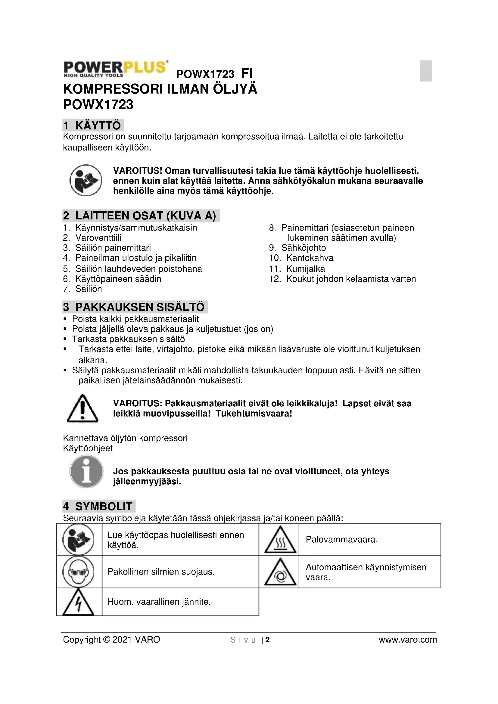 Nimellispaine 10 bar / 145 PSI Säiliön tilavuus 12 l Ilmanpaine (kapasiteetti) 180 l/minPOWX1723 FI Copyright © 2021 VARO S i v u | 7 www.varo.com Paino 13 kg 10 MELU Melupäästöjen arvot on mitattu asianmukaisen standardin mukaan. (K=3) Äänenpainetaso LpA 74 dB(A) Äänitehotaso LwA 97 dB(A) HUOMIO! Käytä kuulosuojaimia, kun äänenpaine on yli 85 dB(A). 11 TAKUU Tälle tuotteelle on annettu 36 kuukauden takuu, joka alkaa hankintapäivämäärästä, jolloin ensimmäinen käyttäjä on ostanut tuotteen. Takuu kattaa kaikki materiaali- tai valmistusviat, mutta ei kata: akkuja, latureita normaalista osien kulumisesta johtuvia vikoja, kuten laakereita, harjoja, kaapeleita eikä tulppia tai lisävarusteita kuten poria, poran teriä, sahan teriä jne.; vahinkoja tai vikoja, jotka johtuvat väärinkäytöstä, onnettomuuksista tai tuotteeseen tehdyistä muutoksista; eikä myöskään kuljetuskustannuksia. Väärästä käytöstä johtuvat viat ja/tai vauriot eivät myöskään kuulu takuun piiriin. Pidätämme myös itsellämme oikeuden hylätä vaatimus, joka koskee työkalun väärästä käytöstä aiheutunutta ruumiillista vammaa. Korjaukset saa suorittaa vain Powerplus työkalujen valtuuttamassa huoltopisteessä. Lisätietoja saat tarvittaessa puhelinnumerosta 00 32 3 292 92 90. Asiakas vastaa myös mahdollisista kuljetuskustannuksista, ellei ole kirjallisesti toisin sovittu. Samanaikaisesti mitään vaatimuksia ei voida tehdä takuuseen, jos laitteessa ilmenevä vika on seurausta laiminlyödystä huollosta tai ylikuormituksesta. Takuun piiriin eivät kuulu viat, jotka johtuvat nesteen tunkeutumisesta laitteeseen, liiallisesta pölystä, tahallisesti aiheutetusta viasta (tahallisesta toiminnasta tai huolimattomuudesta johtuen), väärästä käytöstä (laitteelle sopimattomat käyttötarkoitukset), taitamattomasta käytöstä (esim. käsikirjan ohjeita ei noudateta), väärästä kokoamisesta, salaman iskusta, virheellisestä verkkojännitteestä. Tämä lista ei ole rajoittava. Vaatimusten hyväksyminen takuun piiriin kuuluvana ei voi koskaan johtaa takuukauden pidentämiseen eikä uuden takuukauden alkamiseen, jos laite joudutaan vaihtamaan uuteen. Laitteet tai osat jotka on vaihdettu takuun piiriin kuuluvana, ovat Varo NV:n omaisuutta. Pidätämme itsellämme oikeuden hylätä vaatimukset, jos hankintaa ei voida tarkistaa tai jos on ilmeistä, ettei tuotetta ei ole huollettu asianmukaisesti. (ilmanottoaukkojen puhdistus, hiiliharjojen säännöllinen huolto,…) Säilytä kassakuitti ostopäivämäärän tositteena. Työkalu on palautettava purkamattomana jälleenmyyjälle hyväksyttävän puhtaassa kunnossa, alkuperäisessä muotoillussa laatikossaan (mikäli käytettävissä tälle yksikölle) ostotositteen kera.