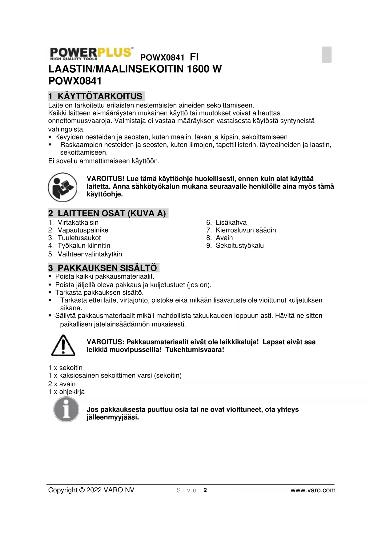 - Säilytä pakkausmateriaalit mikäli mahdollista takuukauden loppuun asti. Hävitä ne sitten paikallisen jätelainsäädännön mukaisesti. VAROITUS: Pakkausmateriaalit eivät ole leikkikaluja! Lapset eivät saa leikkiä muovipusseilla! Tukehtumisvaara! 1 x sekoitin 1 x kaksiosainen sekoittimen varsi (sekoitin) 2 x avain 1 x ohjekirja Jos pakkauksesta puuttuu osia tai ne ovat vioittuneet, ota yhteys jälleenmyyjääsi.POWX0841 FI Copyright © 2022 VARO NV S i v u | 3 www.varo.com 4 SYMBOLIT Tässä käyttöoppaassa ja koneessa käytetään seuraavia symboleita: