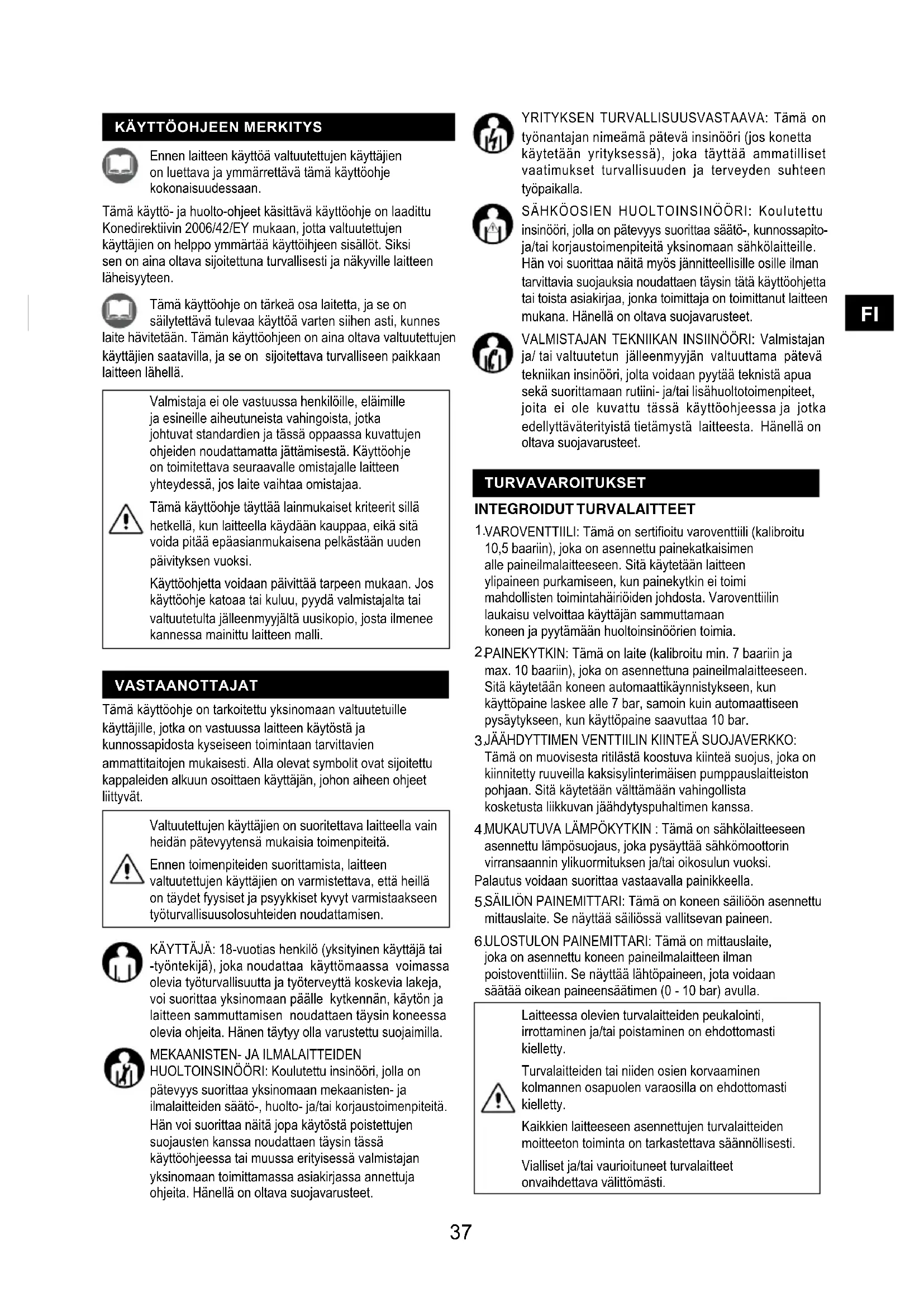 HUOLTOINSINÖÖRI: Koulutettu insinööri, jolla on pätevyys suorittaa yksinomaan mekaanisten- ja ilmalaitteiden säätö-, huolto- ja/tai korjaustoimenpiteitä. Hän voi suorittaa näitä jopa käytöstä poistettujen suojausten kanssa noudattaen täysin tässä käyttöohjeessa tai muussa erityisessä valmistajan yksinomaan toimittamassa asiakirjassa annettuja ohjeita. Hänellä on oltava suojavarusteet. Tämä käyttöohje on tarkoitettu yksinomaan valtuutetuille käyttäjille, jotka on vastuussa laitteen käytöstä ja kunnossapidosta kyseiseen toimintaan tarvittavien ammattitaitojen mukaisesti. Alla olevat symbolit ovat sijoitettu kappaleiden alkuun osoittaen käyttäjän, johon aiheen ohjeet liittyvät. Tämä käyttöohje on tärkeä osa laitetta, ja se on säilytettävä tulevaa käyttöä varten siihen asti, kunnes laite hävitetään. Tämän käyttöohjeen on aina oltava valtuutettujen käyttäjien saatavilla, ja se on sijoitettava turvalliseen paikkaan laitteen lähellä. Ennen laitteen käyttöä valtuutettujen käyttäjien on luettava ja ymmärrettävä tämä käyttöohje kokonaisuudessaan. Tämä käyttö- ja huolto-ohjeet käsittävä käyttöohje on laadittu Konedirektiivin 2006/42/EY mukaan, jotta valtuutettujen käyttäjien on helppo ymmärtää käyttöihjeen sisällöt. Siksi sen on aina oltava sijoitettuna turvallisesti ja näkyville laitteen läheisyyteen.