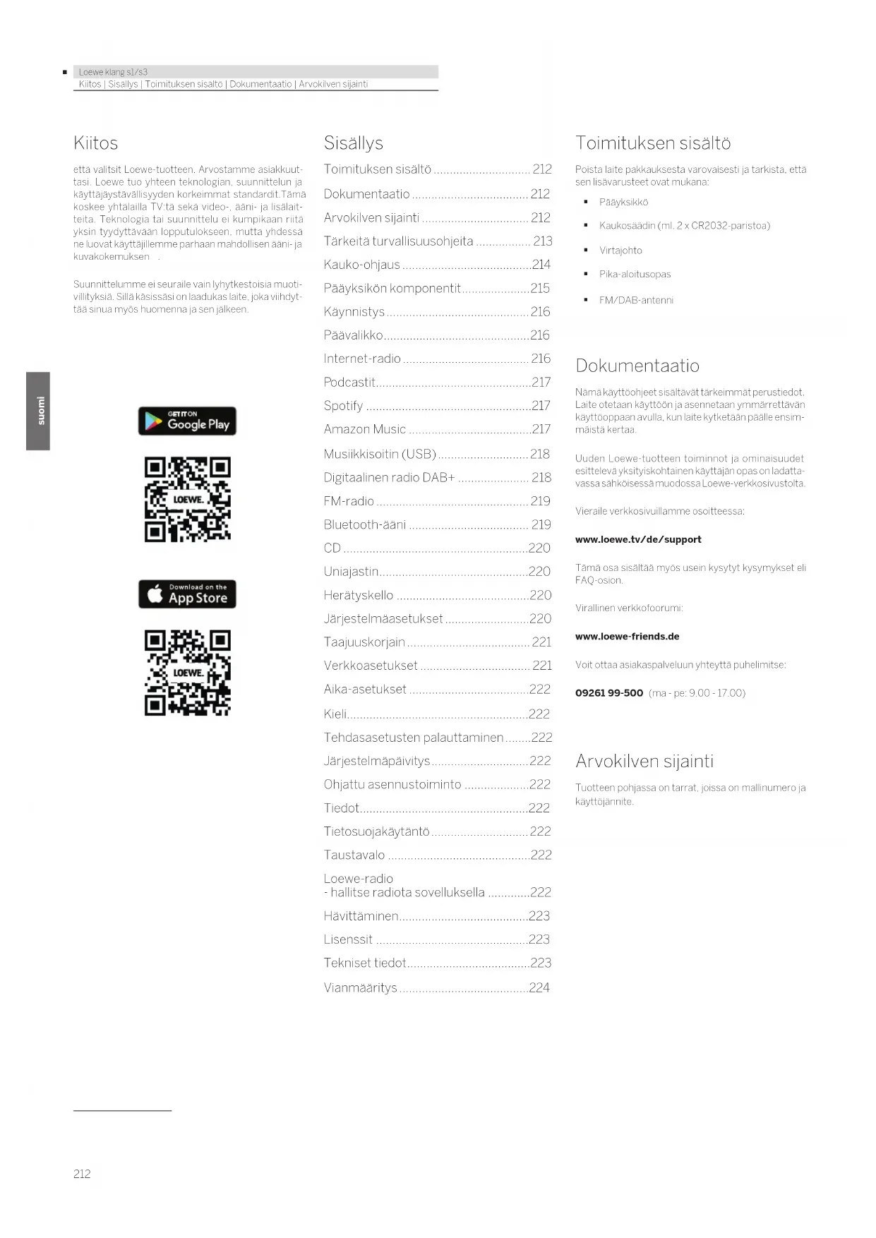 - Vianmääritys Toimituksen sisältö Poista laite pakkauksesta varovaisesti ja tarkista, että sen lisävarusteet ovat mukana: Pääyksikkö Kaukosäädin (ml. 2 x CR2032-paristoa) Virtajohto Pika-aloitusopas FM/DAB-antenni Dokumentaatio Nämä käyttöohjeet sisältävät tärkeimmät perustiedot. Laite otetaan käyttöön ja asennetaan ymmärrettävän käyttöoppaan avulla, kun laite kytketään päälle ensim- mäistä kertaa. Uuden Loewe-tuotteen toiminnot ja ominaisuudet esittelevä yksityiskohtainen käyttäjän opas on ladatta- vassa sähköisessä muodossa Loewe-verkkosivustolta. Vieraile verkkosivuillamme osoitteessa: www.loewe.tv/de/support Tämä osa sisältää myös usein kysytyt kysymykset eli FAQ-osion. Virallinen verkkofoorumi: www.loewe-friends.de Voit ottaa asiakaspalveluun yhteyttä puhelimitse: 09261 99-500 (ma - pe: 9.00 - 17.00) Arvokilven sijainti Tuotteen pohjassa on tarrat, joissa on mallinumero ja käyttöjännite.213 p. 224