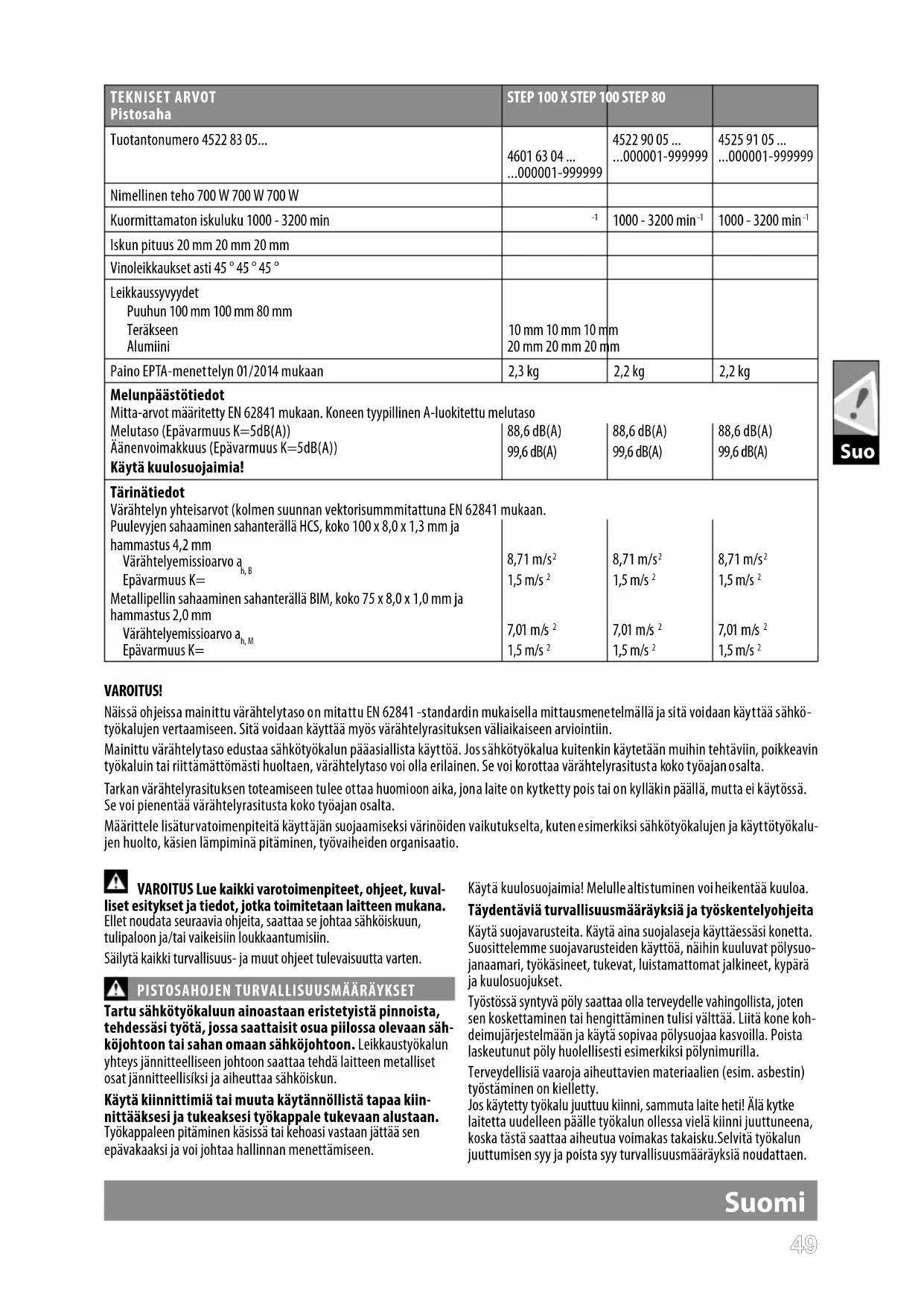 VAROITUS! Näissä ohjeissa mainittu värähtelytaso on mitattu EN 62841 -standardin mukaisella mittausmenetelmällä ja sitä voidaan käyttää sähkö- työkalujen vertaamiseen. Sitä voidaan käyttää myös värähtelyrasituksen väliaikaiseen arviointiin. Mainittu värähtelytaso edustaa sähkötyökalun pääasiallista käyttöä. Jos sähkötyökalua kuitenkin käytetään muihin tehtäviin, poikkeavin työkaluin tai riittämättömästi huoltaen, värähtelytaso voi olla erilainen. Se voi korottaa värähtelyrasitusta koko työajan osalta. Tarkan värähtelyrasituksen toteamiseen tulee ottaa huomioon aika, jona laite on kytketty pois tai on kylläkin päällä, mutta ei käytössä. Se voi pienentää värähtelyrasitusta koko työajan osalta. Määrittele lisäturvatoimenpiteitä käyttäjän suojaamiseksi värinöiden vaikutukselta, kuten esimerkiksi sähkötyökalujen ja käyttötyökalu- jen huolto, käsien lämpiminä pitäminen, työvaiheiden organisaatio. VAROITUS Lue kaikki varotoimenpiteet, ohjeet, kuval- liset esitykset ja tiedot, jotka toimitetaan laitteen mukana. Ellet noudata seuraavia ohjeita, saattaa se johtaa sähköiskuun, tulipaloon ja/tai vaikeisiin louk kaantumisiin. Säilytä kaikki turvallisuus- ja muut ohjeet tulevaisuutta varten.