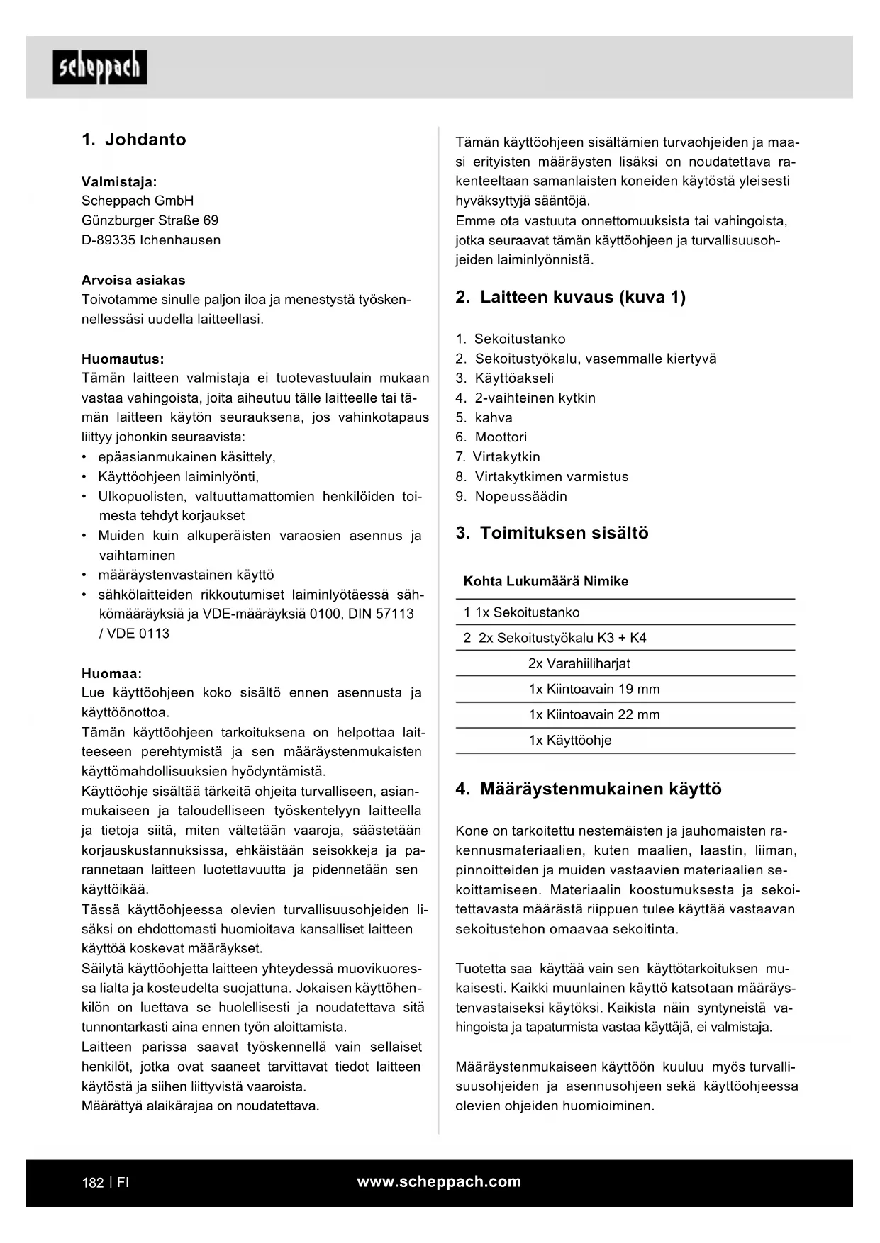 Valmistaja: Scheppach GmbH Günzburger Straße 69 D-89335 Ichenhausen Arvoisa asiakas Toivotamme sinulle paljon iloa ja menestystä työsken- nellessäsi uudella laitteellasi. Huomautus: Tämän laitteen valmistaja ei tuotevastuulain mukaan vastaa vahingoista, joita aiheutuu tälle laitteelle tai tä- män laitteen käytön seurauksena, jos vahinkotapaus liittyy johonkin seuraavista: