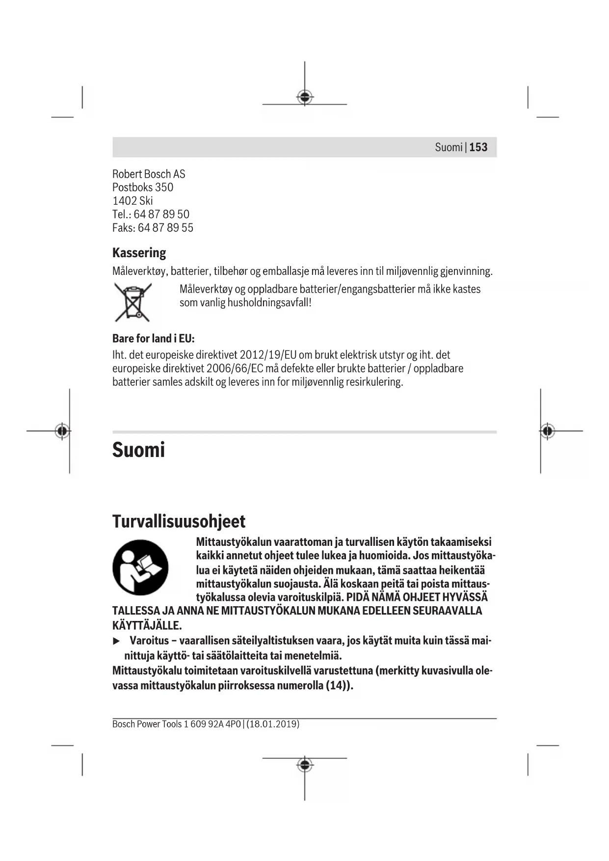 Jaa laskenta väliportaisiin Epäluotettava mittaustulos Kohdepinta ei heijasta tasaisesti (esim. vesi ja lasi). Peitä kohdepinta Lasersäteen ulostuloaukko (13) / vastaa- notinlinssi (12) ovat peitossa. Pidä lasersäteen ulostuloaukko (13) / vas- taanotinlinssi (12) esteettöminä Mittaustulos on epäuskottava Asetettu väärä vertailutaso Valitse mittaukseen sopiva vertailutaso Lasersäteen linjalla on este Laserpisteen täytyy osua kokonaan kohde- pintaan. Bluetooth®-toimintoa ei voi aktivoida 1 609 92A 4P0 | (18.01.2019) Bosch Power ToolsSuomi | 165 Syy Korjaustoimenpide Paristot/akut ovat liian heikkoja. Vaihda paristot/akut Ei Bluetooth®-yhteyttä Bluetooth®-yhteyden häiriö Kytke Bluetooth® pois päältä ja sen jälkeen uudelleen päälle. Tarkasta mobiililaitteesi käyttösovellus. Tarkasta, että mittaustyökalun ja mobiili- laitteen Bluetooth® on aktivoitu. Tarkasta mobiililaite ylikuormituksen va- ralta. Lyhennä mittaustyökalun ja mobiililaitteen välistä välimatkaa. Vältä esteitä (esim. teräsbetoni ja metallio- vet) mittaustyökalun ja mobiililaitteen vä- lillä. Pidä riittävä etäisyys sähkömagneetti- siin häiriölähteisiin (esim. WLAN-lähetti- met). Mittaustyökalu valvoo moitteetonta toimintaa jokaisen mittauksen yh- teydessä. Jos se havaitsee vian, näyttö ilmoittaa enää vain viereisen symbolin. Tässä tapauksessa, tai jos vikaa ei saada poistettua yllä mainituilla korjaustoimenpiteillä, lähetä mittaustyökalu valtuutetun kauppiaan välityksellä Bosch-huoltoon. Mittaustyökalun tarkkuuden tarkistus Voit tarkastaa mittaustyökalun tarkkuuden seuraavasti: – Valitse noin 3–10m pituinen pysyvästi muuttumaton mittausmatka, jonka pituuden tunnet tarkasti (esim. huoneen leveys, oviaukko). Mittaus täytyy tehdä rakennuksen sisällä ja mittauksen kohdepinnan täytyy olla sileä ja hyvin heijastava. – Mittaa matka 10 kertaa peräkkäin. Yksittäiset mittaukset saavat poiketa keskiarvosta korkeintaan ±2mm:n verran. Kirjaa mittaustulokset muistiin, jotta voit verrata tarkkuutta myöhemmin. Hoito ja huolto Huolto ja puhdistus Säilytä ja kuljeta mittauslaitetta vain mukana toimitetussa suojalaukussa. Bosch Power Tools 1 609 92A 4P0 | (18.01.2019)166 | Suomi Pidä aina mittaustyökalu puhtaana. Älä koskaan upota mittaustyökalua veteen tai muihin nesteisiin. Pyyhi lika pois kostealla ja pehmeällä liinalla. Älä käytä puhdistusaineita tai liuottimia. Käsittele varsinkin vastaanotinlinssiä (12) varovasti. Se tulee puhdistaa huolellisesti sa- malla tavalla kuin silmälasit tai kameran linssi. Jos mittaustyökalu on vioittunut, lähetä se huoltoon suojalaukussa (17). Asiakaspalvelu ja käyttöneuvonta Asiakaspalvelu vastaa tuotteesi korjausta ja huoltoa sekä varaosia koskeviin kysymyksiin. Räjäytyskuvat ja varaosatiedot ovat myös verkko-osoitteessa: www.bosch-pt.com Bosch-käyttöneuvontatiimi vastaa mielellään tuotteita ja tarvikkeita koskeviin kysymyk- siin. Ilmoita kaikissa kyselyissä ja varaosatilauksissa 10‑numeroinen tuotenumero, joka on il- moitettu tuotteen mallikilvessä. Suomi Robert Bosch Oy Bosch-keskushuolto Pakkalantie 21 A 01510 Vantaa Voitte tilata varaosat suoraan osoitteesta www.bosch-pt.fi. Puh.: 0800 98044 Faksi: 010 296 1838 www.bosch.fi Hävitys Käytöstä poistetut mittaustyökalut, akut/paristot, lisätarvikkeet ja pakkaukset tulee toi- mittaa ympäristöystävälliseen uusiokäyttöön. Älä heitä mittaustyökaluja tai akkuja/paristoja talousjätteisiin! Koskee vain EU‑maita: Eurooppalaisen direktiivin 2012/19/EU mukaan käyttökelvottomat mittaustyökalut ja eurooppalaisen direktiivin 2006/66/EY mukaan vialliset tai loppuun käytetyt akut/paris- tot täytyy kerätä erikseen ja toimittaa ympäristöystävälliseen kierrätykseen. 1 609 92A 4P0 | (18.01.2019) Bosch Power ToolsΕλληνικά | 167