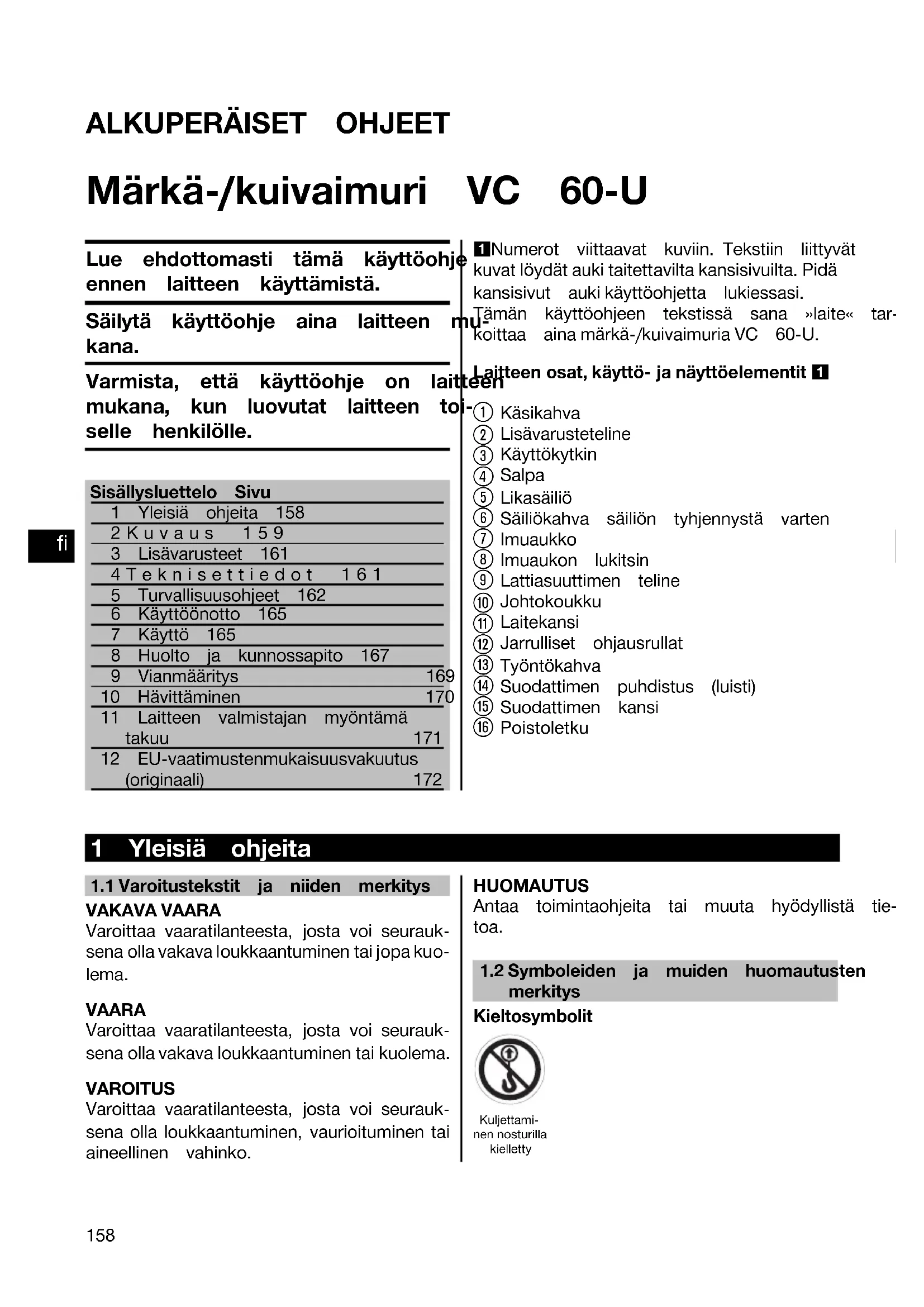 Printed: 05.12.2013 | Doc-Nr: PUB / 5071295 / 000 / 02ALKUPERÄISET OHJEET Märkä-/kuivaimuri VC 60‑U Lue ehdottomasti tämä käyttöohjeennen laitteen käyttämistä.Säilytä käyttöohje aina laitteen mu-kana.Varmista, että käyttöohje on laitteenmukana, kun luovutat laitteen toi-selle henkilölle.Sisällysluettelo Sivu1 Yleisiä ohjeita 1582Kuvaus 1593 Lisävarusteet 1614Teknisettiedot 1615 Turvallisuusohjeet 1626 Käyttöönotto 1657 Käyttö 1658 Huolto ja kunnossapito 1679 Vianmääritys 16910 Hävittäminen 17011 Laitteen valmistajan myöntämätakuu 17112 EU-vaatimustenmukaisuusvakuutus(originaali) 1721 Numerot viittaavat kuviin. Tekstiin liittyvät kuvatlöydätaukitaitettavilta kansisivuilta. Pidä kansisivut auki käyttöohjetta lukiessasi.Tämän käyttöohjeen tekstissä sana »laite« tar-koittaa aina märkä-/kuivaimuria VC 60‑U. Laitteen osat, käyttö- ja näyttöelementit 1