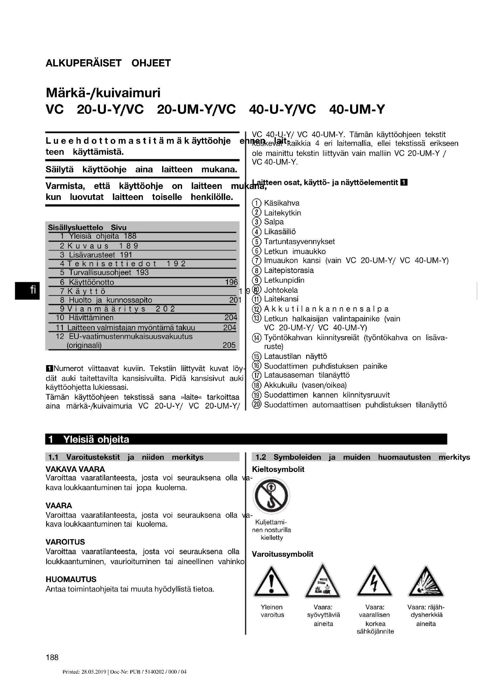 Printed: 24.03.2014 | Doc-Nr: PUB / 5140202 / 000 / 03 Printed: 28.03.2019 | Doc-Nr: PUB / 5140202 / 000 / 04ALKUPERÄISET OHJEET Märkä-/kuivaimuri VC 20-U‑Y/VC 20-UM‑Y/VC 40-U‑Y/VC 40-UM‑Y Lueehdottomastitämäkäyttöohje ennen lait- teen käyttämistä. Säilytä käyttöohje aina laitteen mukana. Varmista, että käyttöohje on laitteen mukana, kun luovutat laitteen toiselle henkilölle. Sisällysluettelo Sivu1 Yleisiä ohjeita 1882Kuvaus 1893 Lisävarusteet 1914Teknisettiedot 1925 Turvallisuusohjeet 1936 Käyttöönotto 1967Käyttö 1988 Huolto ja kunnossapito 2019Vianmääritys 20210 Hävittäminen 204 11 Laitteen valmistajan myöntämä takuu 204 12 EU-vaatimustenmukaisuusvakuutus(originaali) 2051 Numerot viittaavat kuviin. Tekstiin liittyvät kuvat löy-dät auki taitettavilta kansisivuilta. Pidä kansisivut aukikäyttöohjetta lukiessasi. Tämän käyttöohjeen tekstissä sana »laite« tarkoittaa aina märkä-/kuivaimuria VC 20‑U‑Y/ VC 20‑UM‑Y/ VC 40‑U‑Y/ VC 40‑UM‑Y. Tämän käyttöohjeen tekstit koskevat kaikkia 4 eri laitemallia, ellei tekstissä erikseen ole mainittu tekstin liittyvän vain malliin VC 20‑UM‑Y / VC 40‑UM‑Y. Laitteen osat, käyttö- ja näyttöelementit 1