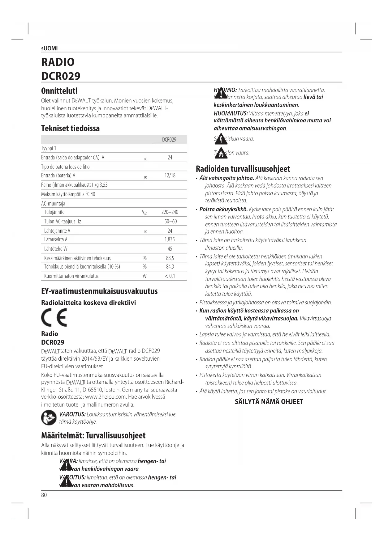 Keskimääräinen aktiivinen tehokkuus % 88,5 Tehokkuus pienellä kuormituksella (10 %) % 84,3 Kuormittamaton virrankulutus W < 0,1 EY-vaatimustenmukaisuusvakuutus Radiolaitteita koskeva direktiivi Radio DCR029 DeWALT täten vakuuttaa, että DeWALT -radio DCR029 täyttää direktiivin 2014/53/EY ja kaikkien soveltuvien EU-direktiivienvaatimukset. Koko EU-vaatimustenmukaisuusvakuutus on saatavilla pyynnöstä DeWALT ilta ottamalla yhteyttä osoitteeseen Richard- Klinger-Straße 11, D-65510, Idstein, Germany tai seuraavasta verkko-osoitteesta: www.2helpu.com. Hae arvokilvessä ilmoitetun tuote- ja mallinumeronavulla. VAROITUS: Loukkaantumisriskin vähentämiseksi lue tämäkäyttöohje. Määritelmät: Turvallisuusohjeet Alla näkyvät selitykset liittyvät turvallisuuteen. Lue käyttöohje ja kiinnitä huomiota näihinsymboleihin.