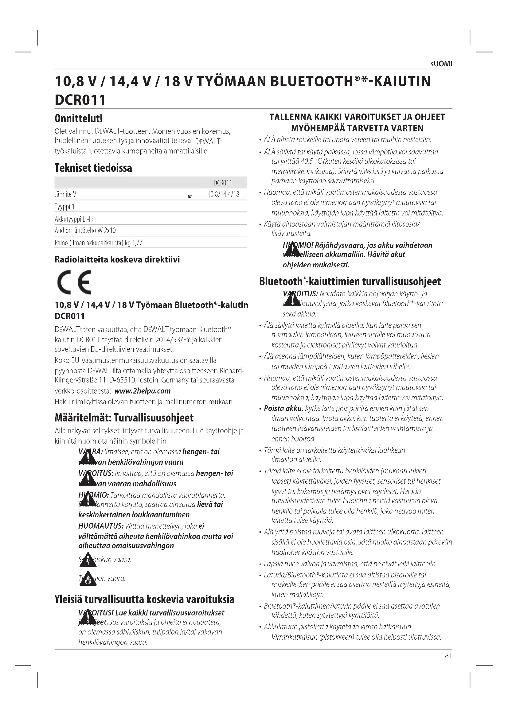 VAROITUS! Lue kaikki turvallisuusvaroitukset ja ohjeet. Jos varoituksia ja ohjeita ei noudateta, on olemassa sähköiskun, tulipalon ja/tai vakavan henkilövahingonvaara. Suomi (käännetty alkuperäisestä käyttöohjeesta) 10,8 V / 14,4 V / 18 V TYÖMAAN BLUETOOTH®*KAIUTIN DCR01182 sUOMI