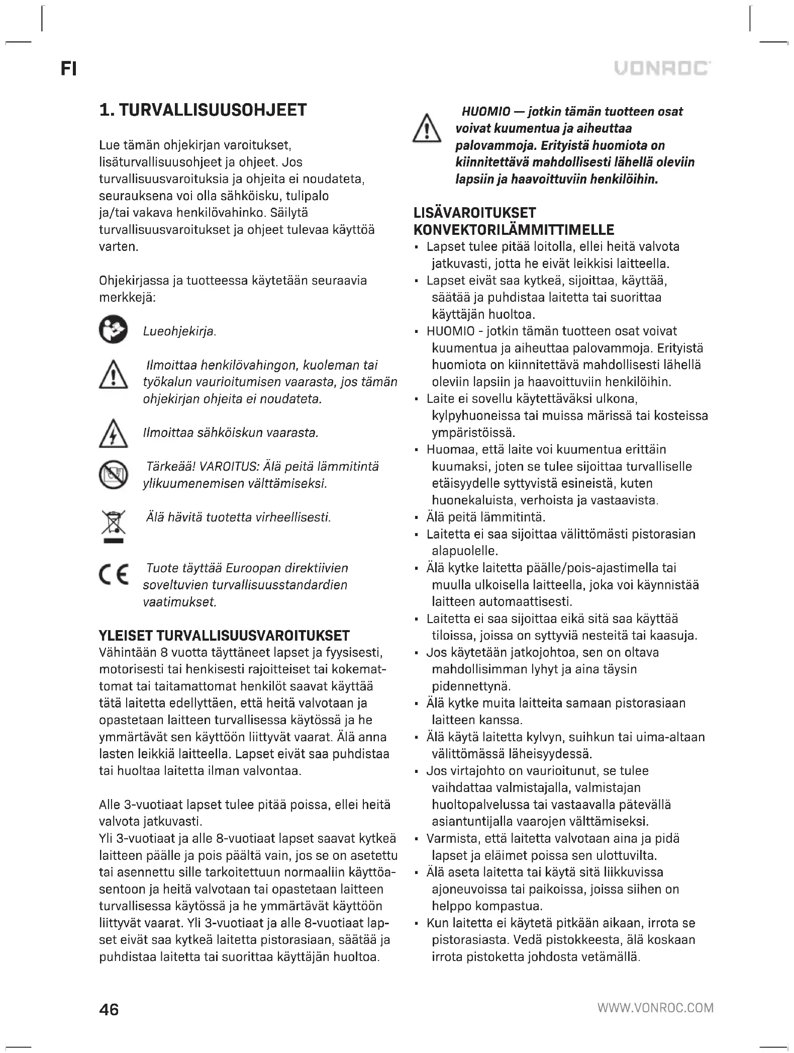 Lue tämän ohjekirjan varoitukset, lisäturvallisuusohjeet ja ohjeet. Jos turvallisuusvaroituksia ja ohjeita ei noudateta, seurauksena voi olla sähköisku, tulipalo ja/tai vakava henkilövahinko. Säilytä turvallisuusvaroitukset ja ohjeet tulevaa käyttöä varten. Ohjekirjassa ja tuotteessa käytetään seuraavia merkkejä: Lue ohjekirja. Ilmoittaa henkilövahingon, kuoleman tai työkalun vaurioitumisen vaarasta, jos tämän ohjekirjan ohjeita ei noudateta. Ilmoittaa sähköiskun vaarasta. Tärkeää! VAROITUS: Älä peitä lämmitintä ylikuumenemisen välttämiseksi. Älä hävitä tuotetta virheellisesti. Tuote täyttää Euroopan direktiivien soveltuvien turvallisuusstandardien vaatimukset. YLEISET TURVALLISUUSVAROITUKSET Vähintään 8 vuotta täyttäneet lapset ja fyysisesti, motorisesti tai henkisesti rajoitteiset tai kokemat- tomat tai taitamattomat henkilöt saavat käyttää tätä laitetta edellyttäen, että heitä valvotaan ja opastetaan laitteen turvallisessa käytössä ja he ymmärtävät sen käyttöön liittyvät vaarat. Älä anna lasten leikkiä laitteella. Lapset eivät saa puhdistaa tai huoltaa laitetta ilman valvontaa. Alle 3-vuotiaat lapset tulee pitää poissa, ellei heitä valvota jatkuvasti. Yli 3-vuotiaat ja alle 8-vuotiaat lapset saavat kytkeä laitteen päälle ja pois päältä vain, jos se on asetettu tai asennettu sille tarkoitettuun normaaliin käyttöa- sentoon ja heitä valvotaan tai opastetaan laitteen turvallisessa käytössä ja he ymmärtävät käyttöön liittyvät vaarat. Yli 3-vuotiaat ja alle 8-vuotiaat lap- set eivät saa kytkeä laitetta pistorasiaan, säätää ja puhdistaa laitetta tai suorittaa käyttäjän huoltoa. HUOMIO — jotkin tämän tuotteen osat voivat kuumentua ja aiheuttaa palovammoja. Erityistä huomiota on kiinnitettävä mahdollisesti lähellä oleviin lapsiin ja haavoittuviin henkilöihin. LISÄVAROITUKSET KONVEKTORILÄMMITTIMELLE