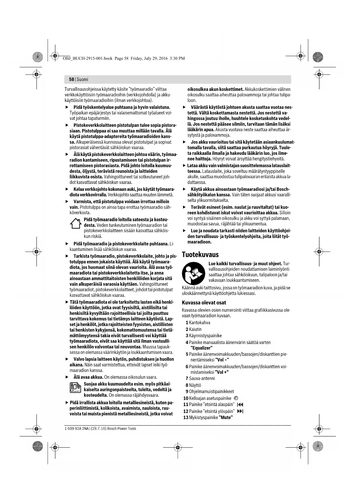 Vahvistimen nimellisteho (kun pistokeverkkolaitetta käytetään) 2x5W Vastaanottoalue –ULA –KA MHz kHz 87,5–108 531–1602 1) riippuen käytetystä akusta2) rajoitettu tehokkuus, kun lämpötilat <0 °CTekniset tiedot määritetty toimitukseen kuuluvan akun kanssa. Pistokeverkkolaite Tuotenumero 1 600 A00 0.. Sisäänmenojännite V~ 100–240 Taajuus Hz 50/60 Sisäänmenovirta mA 500 Ulostulojännite V= 12 Ulostulovirta mA 1500 Paino vastaa EPTA-Procedure 01:2014 kg 0,20 Suojausluokka /II Näyttö Kapasiteetti 2/3 1/3 <1/3 Varalla Akku tyhjä OBJ_BUCH-2915-001.book Page 59 Friday, July 29, 2016 3:30 PM60 | Suomi 1 609 92A 2NA | (29.7.16) Bosch Power Tools Käytä ainoastaan alkuperäistä Bosch-pistokeverkko- laitetta, joka on tarkoitettu työmaaradiollesi. Vain täten työmaaradion moitteeton käyttö on mahdollista. Aseta suojaksi lialta 12 V liitäntähylsyn 23 suojakansi takaisin paikoilleen, kun irrotat laitepistokkeen. Voit säilyttää pistokeverkkolaitteen 24 säilytyslokerossa, kun sitä ei käytetä. Avaa lukitusvipu 21 ja käännä auki säilytyske- ron kansi 20. Puskuriparistojen asennus/vaihto Jotta kelloaika voidaan tallentaa työmaaradioon, tulee siihen asentaa puskuriparistot. Tähän suosittelemme käyttämään al- kali-mangaani-paristoja. Avaa paristokotelo avaamalla ruuvi 18 ja poistamalla paristo- kotelon kansi 19. Aseta puskuriparistot paikoilleen. Varmista paristojen oikea napaisuus paristokotelon kannen ulkopin- nassa olevan kuvan mukaisesti. Aseta paristokotelon kansi 19 paikoilleen ja ruuvaa se kiinni ruuvin 18 avulla. Vaihda puskuriparistot, jos työmaaradion näyttö e heikkenee eikä työmaaradion kellonaika enää pidä paikkansa. Vaihda aina kaikki paristot samanaikaisesti. Käytä yksin- omaan saman valmistajan saman tehoisia paristoja. Poista puskuriparistot työmaaradiosta, jos työmaara- diota ei käytetä pitkään aikaan. Puskuriparistot saatta- vat hapettua tai purkautua itsestään pitkäaikaisessa varas- toinnissa. Käyttö Suojaa työmaaradio kosteudelta ja suoralta auringon- paisteelta. Työmaaradio on tarkoitettu käytettäväksi vain kuivassa sisätilassa. Audiokäyttö Käynnistys ja pysäytys Käynnistä työmaaradio painamalla käynnistyspainiketta 3. Näyttö 8 aktivoituu ja ennen edellistä työmaaradion sammu- tusta kytkettyä audiolähdettä toistetaan. Huomio: Kun työmaaradiota käytetään ensimmäistä kertaa akun kanssa tai, kun sitä ei ole käytetty pitkään aikaan, saat- taa olla tarpeellista painaa käynnistyspainiketta 3 monta ker- taa tai pitkään. Näytön 8 valaistus kytkeytyy muutamaksi sekunniksi jokai- sesta näppäilystä. Sammuta työmaaradio painamalla käynnistyspainiketta 3 uu- delleen. Audiolähteen kyseinen asetus tallentuu. Kytke energiansäästön takia työmaaradio päälle vain, kun käytät sitä. Äänenvoimakkuuden asetus Työmaaradion käynnistyksen jälkeen on aina keskiverto ää- nenvoimakkuus (arvo 10) säädettynä. Lisää äänenvoimakkuutta painamalla painiketta ”Vol +” 6, hiljennä äänenvoimakkuutta painamalla painiketta ”Vol –” 5. Äänenvoimakkuusasetuksen ”VL”, arvo väliltä 0 ja 20 näkyy muutaman sekunnin ajan ruudun näytössä e. Aseta äänenvoimakkuus pienelle arvolle ennen radiolähetti- men valintaa tai vaihtoa ja keskisuurelle akulle, ennen kuin käynnistät ulkoisen äänilähteen. Voit mykistää äänen painamalla painiketta ”Mute” 13. Äänen palauttamiseksi painat joko painiketta ”Mute” 13 uudelleen tai jompaa kumpaa äänenvoimakkuuspainiketta ”Vol +” 6 tai ”Vol –” 5. Äänenvärin asetus Työmaaradiossa on sisäänrakennettu taajuuskorjain parasta mahdollista äänenlaatua varten. Muuta bassotasoa manuaalisesti painamalla painiketta ”Equalizer” 4 kerran. Näyttöön e ilmestyvät ”BA” sekä bas- sotason tallennettu arvo. Paina diskanttitasoa varten paini- ketta ”Equalizer” 4 uudelleen, näyttöön e ilmestyvät ”TR” se- kä diskanttitason tallennettu arvo. Basso- ja diskanttitasot voidaan muuttaa väliltä –5 ... +5. Nosta näkyvää arvoa painamalla painiketta ”Vol +” 6 ja alen- na painamalla painiketta ”Vol –” 5. Muutetut arvot tallentuvat automaattisesti, kun näyttö e muutaman sekunnin viimeisen painalluksen jälkeen siirtyy takaisin osoittamaan kellonaikaa. Audiolähteen valinta Valitse audiolähde painamalla painiketta ”Source” 14 niin monta kertaa, että näyttöön f tulee haluttu sisäinen audioläh- de (katso ”Radioasemien viritys/tallennus”, sivu 60) tai ulkoi- nen audiolähde (katso ”Ulkoisen audiolähteen liitäntä”, sivu 61): – ”FM”: radion ULA alue, – ”AM”: radion KA alue, – ”AUX”: ulkoinen audiolähde (esim. CD-soitin) 3,5 mm:n hylsyn 22 kautta. Sauva-antennin suuntaus Työmaaradion toimitetaan asennetulla sauva-antennilla 7. Käännä radiovastaanoton aikana sauva-antenni suuntaan, josta saa parhaan vastaanoton. Jos riittävän hyvää vastaanottoa ei saa, täytyy työmaaradio siirtää paikkaan, missä vastaanotto on parempi. Huomio: Jos työmaaradiota käytetään radioasemien, radio- laitteiden tai muitten elektronisten laitteiden välittömässä lä- heisyydessä, saattaa radiovastaanotossa esiintyä häiriöitä. Radioasemien viritys/tallennus Paina audiolähteen valintapainiketta ”Source” 14 niin monta kertaa, että näyttöön f tulee ”FM” ULA-vastaanottoaluetta varten tai ”AM” keskiaaltovastaanottoaluetta (KA) varten. Paina määrätyn radiotaajuuden virittämiseksi painiketta ”etsintä ylöspäin” 12, taajuuden nostamiseksi, tai paini- ketta ”etsintä alaspäin” 11, taajuuden pienentämiseksi. Kyseinen taajuus näkyy näytössä a. Etsi radioasemia, joilla on voimakas signaali painamalla painiketta ”etsintä alaspäin” 12 tai painiketta ”etsintä ylöspäin” 11 ja pitämällä se hetken painettuna. Löydetyn radioaseman taajuus ilmestyy näyttöön