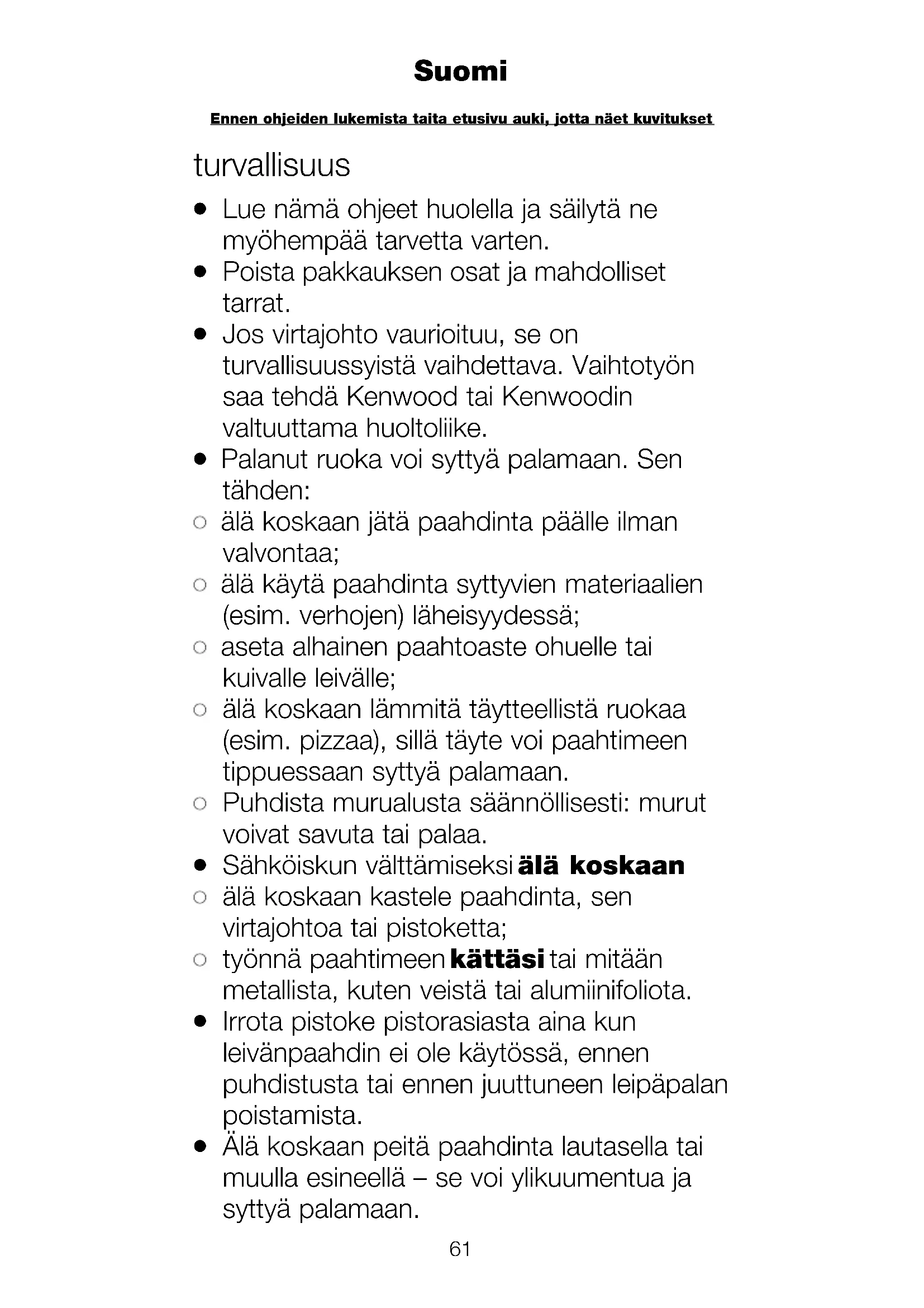 Suomi Ennen ohjeiden lukemista taita etusivu auki, jotta näet kuvitukset turvallisuus