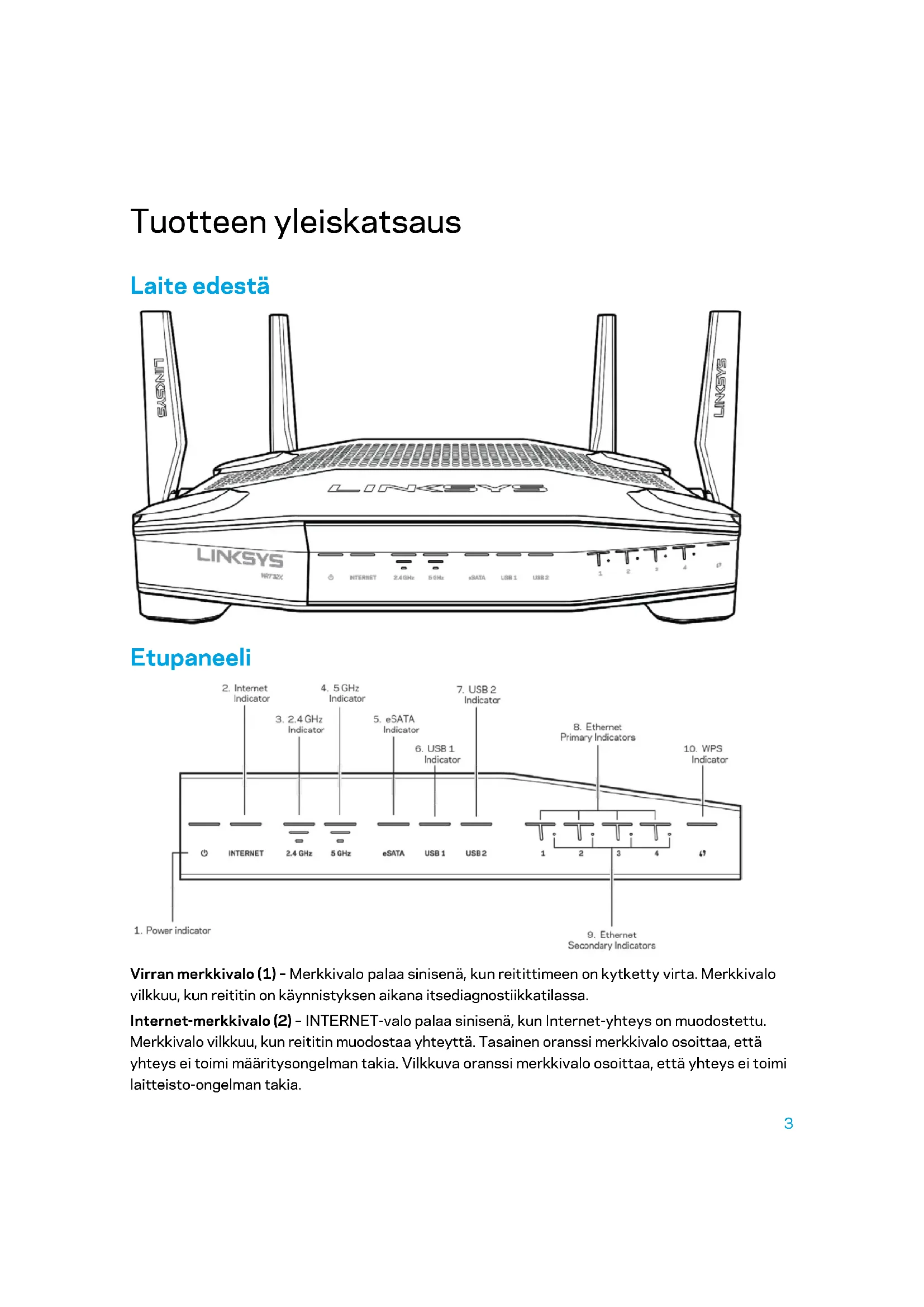 - Käyttöympäristötiedot Tuotteen yleiskatsaus Laite edestä Etupaneeli Virran merkkivalo (1) – Merkkivalo palaa sinisenä, kun reitittimeen on kytketty virta. Merkkivalo vilkkuu, kun reititin on käynnistyksen aikana itsediagnostiikkatilassa. Internet-merkkivalo (2) – INTERNET-valo palaa sinisenä, kun Internet-yhteys on muodostettu. Merkkivalo vilkkuu, kun reititin muodostaa yhteyttä. Tasainen oranssi merkkivalo osoittaa, että yhteys ei toimi määritysongelman takia. Vilkkuva oranssi merkkivalo osoittaa, että yhteys ei toimi laitteisto-ongelman takia.4 2,4 GHz:n merkkivalo (3) – Merkkivalo palaa tasaisen sinisenä, kun 2,4 GHz:n verkkoon on kytketty asiakaslaitteita. Merkkivalo vilkkuu, kun reititin lähettää tai vastaanottaa tietoja 2,4 GHz:n verkossa. 5 GHz:n merkkivalo (4) – Merkkivalo palaa tasaisen sinisenä, kun 5 GHz:n verkkoon on kytketty asiakaslaitteita. Merkkivalo vilkkuu, kun reititin lähettää tai vastaanottaa tietoja 5 GHz:n verkossa. eSATA-merkkivalo (5) – Jos valo ei pala, USB/eSATA-portti ei ole käytössä tai siihen on kytketty USB-laite. Valo palaa sinisenä, kun eSATA-laite on yhdistetty. Valon vilkkuminen ilmaisee että eSATA-portissa on toimintaa. USB1-merkkivalo (6) – Jos valo ei pala, USB/eSATA-portti ei ole käytössä tai siihen on kytketty eSATA-laite. Valo palaa sinisenä, kun USB-laite on yhdistetty. Valon vilkkuminen ilmaisee että portissa on toimintaa. USB2-merkkivalo (7) – Valo palaa sinisenä, kun USB-laite on yhdistetty. Valon vilkkuminen ilmaisee että portissa on toimintaa. ETHERNET 1–4 (ensisijainen) (8) – Nämä numeroidut merkkivalot vastaavat reitittimen takapaneelin numeroituja portteja. Jos merkkivalo palaa sinisenä, reititin on kytketty johonkin laitteeseen kyseisen portin kautta. Sen vilkkuminen osoittaa, että kyseisessä portissa on verkkotoimintaa. ETHERNET 1–4 (toissijainen) (9) – Jos valo ei pala, reititin on kytketty johonkin laitteeseen kyseisen portin kautta 10/100 Mbps:n yhteydellä. Sinisenä palava merkkivalo ilmaisee, että reititin on kytketty laitteeseen 1 000 Mbps:n yhteydellä. WPS-merkkivalo (10) – Merkkivalo vilkkuu hitaasti enintään kahden minuutin ajan Wi-Fi Protected Setup -määrityksen aikana. Merkkivalo palaa tasaisesti sinisenä viiden sekunnin ajan, kun yhteys on muodostettu. Valo vilkkuu oranssina, jos WPS-prosessi epäonnistuu. Jos näin tapahtuu, varmista, että asiakaslaite tukee WPS-toimintoa. Odota, kunnes valo on sammunut, ja yritä sitten uudelleen. Reititin tukee yhtä WPS-istuntoa kerrallaan.5 Laite takaa Säädettävät antennit (1) – Neljä erillistä säädettävää antennia on liitettävä reitittimeen ennen virran kytkemistä. Kytke antenni reitittimen antenniporttiin kääntämällä antennin liitintä myötäpäivään. Huomautus: Paras suorituskyky saadaan asettamalla sivuilla olevat antennit pystysuuntaan vasemmalla olevan kuvan mukaisesti. Wi-Fi Protected Setup™ -painike (2) – Painamalla tätä voit määrittää langattoman yhteyden suojauksen Wi-Fi Protected Setup -yhteensopivissa verkkolaitteissa. Ethernet-portit (3) – Kytke Ethernet-kaapelit sinisiin Gigabit (10/100/1000) -portteihin ja langallista verkkoyhteyttä käyttävin laitteisiin. Huomautus: Paras suorituskyky saadaan käyttämällä Ethernet-porteissa vähintään CAT5e- luokan kaapeleita. Internet-portti (4) – Kytke Ethernet-kaapeli keltaiseen Gigabit (10/100/1000) -porttiin ja laajakaistayhteyden kaapeli-, DSL- tai valokuitumodeemiin. Huomautus: Paras suorituskyky saadaan käyttämällä Internet-porteissa vähintään CAT5e- luokan kaapeleita.6 USB 3.0 -portti (5) – Yhdistä ja jaa USB-asema kotiverkkoon tai Internetiin. USB 2.0/eSATA -yhdistelmäportti (6) – Yhdistä ja jaa USB- tai eSATA-asema kotiverkkoon tai Internetiin. Nollauspainike (7) – Voit palauttaa reitittimen tehdasasetukset pitämällä tätä painiketta painettuna 10 sekuntia (kunnes virran merkkivalo alkaa vilkkua). Virtaliitäntä (8) – Kytke mukana toimitettu verkkovirtasovitin tähän liitäntään. Virtakytkin (9) – Kytke virta reitittimeen painamalla kytkin |-asentoon.7 Käytön aloittaminen: Perusteet Asennuksen viimeistelyyn tarvitset tietokoneen tai mobiililaitteen. p. 213