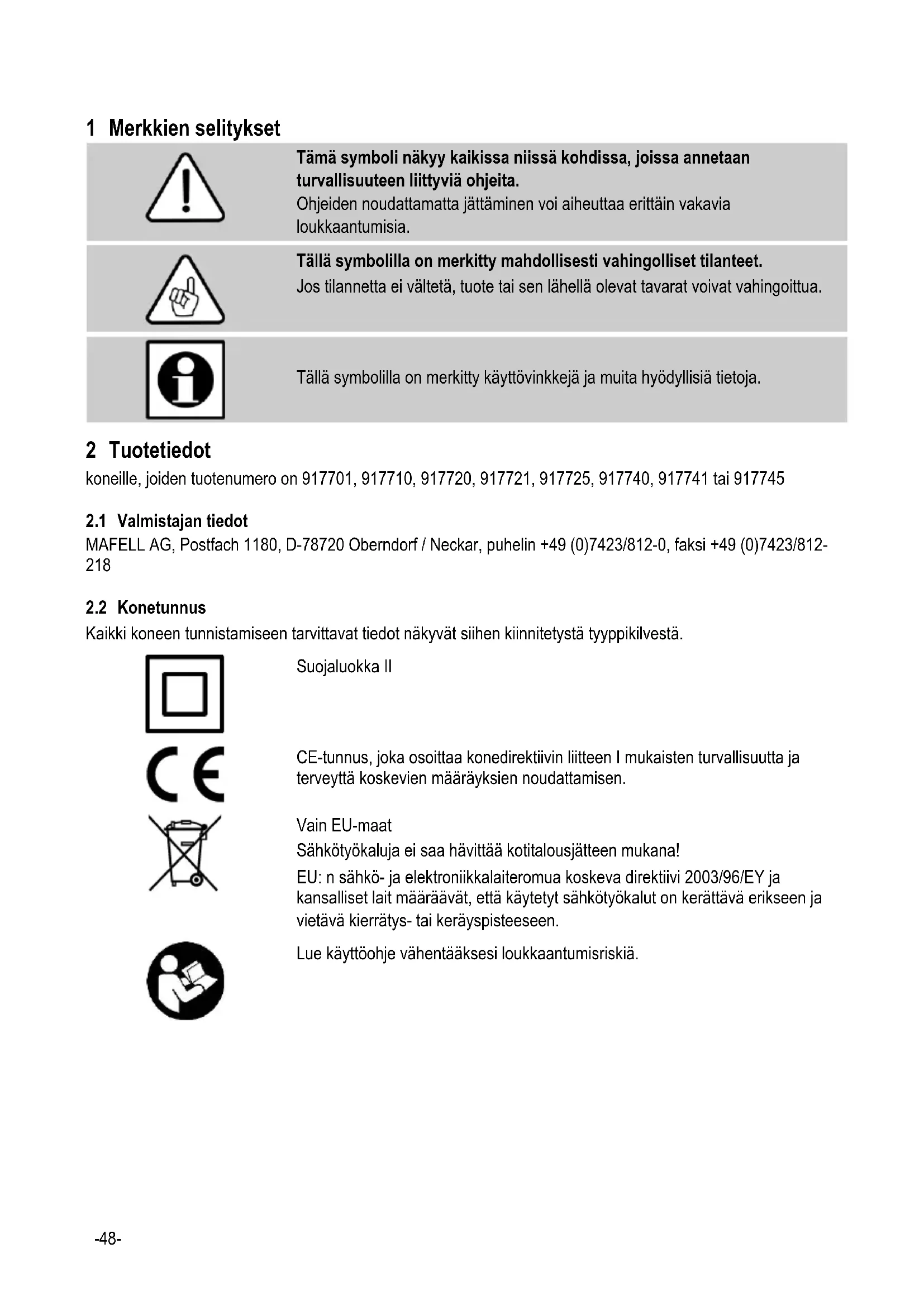 Yleiset ohjeet: - Lapset ja nuoret eivät saa käyttää tätä konetta. Tästä poikkeuksena ovat asiantuntevan henkilön valvonnassa olevat nuoret. - Älä koskaan työskentele ilman määräysten mukaisia turvalaitteita äläkä muuta koneessa mitään, mikä voisi heikentää turvallisuutta. - Konetta ulkona käytettäessä suosittelemme vikavirtakytkimen asentamista. - Vialliset johdot ja pistokkeet on vaihdettava heti uusiin. - Varo, että johto ei taitu. Varsinkaan koneen kuljetuksen ja varastoinnin aikana johtoa ei saa kiertää koneen ympärille. Henkilökohtaisten turvavarusteiden käyttö: - Käytä aina käytön aikana kuulosuojaimia. - Hiottaessa syntyvä pöly on usein terveydelle vaarallista (esim. hiottaessa tammea ja pyökkiä, mineraalimateriaaleja, metalleja tai maalipintoja, jotka sisältävät lyijyä tai muita vaarallisia aineita) eikä se saa päästä kehoon. Älä kosketa tai hengitä sisään pölyä. Käytä pölynimurointia ja soveltuvaa pölynsuojanaamaria. Poista kerrostunut pöly perusteellisesti, esim. imuroimalla soveltuvalla erikoispölynimurilla. Huomioi tämä myös suodatinpussia vaihdettaessa Käyttöä koskevat ohjeet: - Älä vie kättäsi hiomaristikon tai sen kiinnittinen värähtelyalueelle. Pidä toisella kädellä kiinni lisäkahvasta tai moottorin suojakotelosta. - Älä missään tapauksessa pidä työkappaletta paikoillaan kättä tai jalkaa käyttäen. Kiinnitä työkappale tukevalle alustalle. - Varmista työkappale poisliukumisen varalta esim. ruuvipuristimilla. - Pidä huoli siitä, että seisot tukevasti ja varmasti ja että valaistus on riittävä. - Käytä vain tässä käyttöohjeessa annettujen mittojen kokoisia hiomaverkkoja. Huoltoa ja kunnossapitoa koskevat ohjeet: - Koko koneen ja varsinkin sen säätölaitteiden ja ohjaimien säännöllinen puhdistus on tärkeä turvallisuustekijä. - Ainoastaan alkuperäisten MAFELL-varaosien ja - tarvikkeiden käyttö on sallittua. Muuten valmistajan takuu ja vastuu raukeaa.
