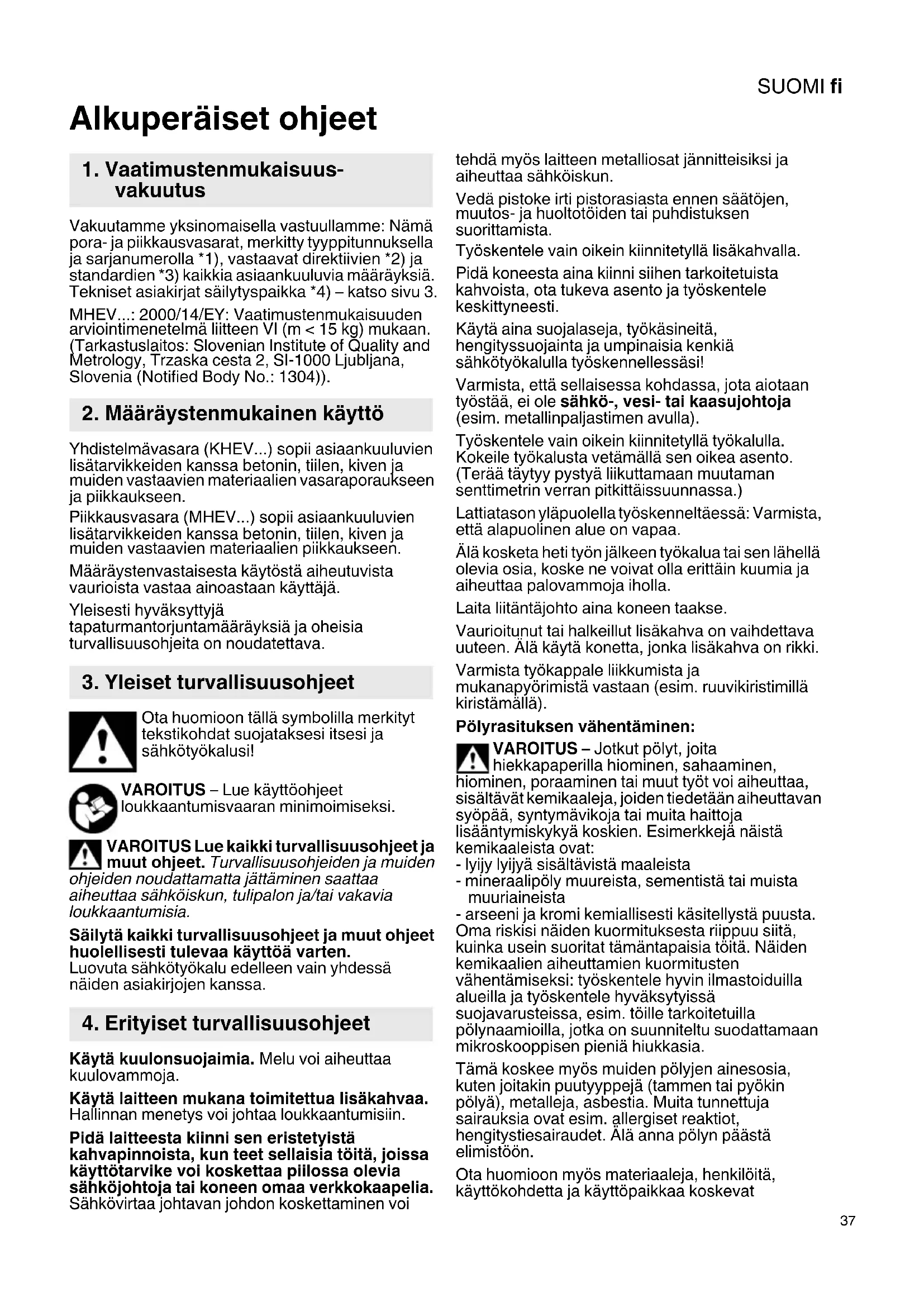 Alkuperäiset ohjeet Vakuutamme yksinomaisella vastuullamme: Nämä pora- ja piikkausvasarat, merkitty tyyppitunnuksella ja sarjanumerolla *1), vastaavat direktiivien *2) ja standardien *3) kaikkia asiaankuuluvia määräyksiä. Tekniset asiakirjat säilytyspaikka *4) – katso sivu 3. MHEV...: 2000/14/EY: Vaatimustenmukaisuuden arviointimenetelmä liitteen VI (m < 15 kg) mukaan. (Tarkastuslaitos: Slovenian Institute of Quality and Metrology, Trzaska cesta 2, SI-1000 Ljubljana, Slovenia (Notified Body No.: 1304)). Yhdistelmävasara (KHEV...) sopii asiaankuuluvien lisätarvikkeiden kanssa betonin, tiilen, kiven ja muiden vastaavien materiaalien vasaraporaukseen ja piikkaukseen. Piikkausvasara (MHEV...) sopii asiaankuuluvien lisätarvikkeiden kanssa betonin, tiilen, kiven ja muiden vastaavien materiaalien piikkaukseen. Määräystenvastaisesta käytöstä aiheutuvista vaurioista vastaa ainoastaan käyttäjä. Yleisesti hyväksyttyjä tapaturmantorjuntamääräyksiä ja oheisia turvallisuusohjeita on noudatettava. Ota huomioon tällä symbolilla merkityt tekstikohdat suojataksesi itsesi ja sähkötyökalusi! VAROITUS – Lue käyttöohjeet loukkaantumisvaaran minimoimiseksi. VAROITUS Lue kaikki turvallisuusohjeet ja muut ohjeet. Turvallisuusohjeiden ja muiden ohjeiden noudattamatta jättäminen saattaa aiheuttaa sähköiskun, tulipalon ja/tai vakavia loukkaantumisia. Säilytä kaikki turvallisuusohjeet ja muut ohjeet huolellisesti tulevaa käyttöä varten. Luovuta sähkötyökalu edelleen vain yhdessä näiden asiakirjojen kanssa. Käytä kuulonsuojaimia. Melu voi aiheuttaa kuulovammoja. Käytä laitteen mukana toimitettua lisäkahvaa. Hallinnan menetys voi johtaa loukkaantumisiin. Pidä laitteesta kiinni sen eristetyistä kahvapinnoista, kun teet sellaisia töitä, joissa käyttötarvike voi koskettaa piilossa olevia sähköjohtoja tai koneen omaa verkkokaapelia. Sähkövirtaa johtavan johdon koskettaminen voi tehdä myös laitteen metalliosat jännitteisiksi ja aiheuttaa sähköiskun. Vedä pistoke irti pistorasiasta ennen säätöjen, muutos- ja huoltotöiden tai puhdistuksen suorittamista. Työskentele vain oikein kiinnitetyllä lisäkahvalla. Pidä koneesta aina kiinni siihen tarkoitetuista kahvoista, ota tukeva asento ja työskentele keskittyneesti. Käytä aina suojalaseja, työkäsineitä, hengityssuojainta ja umpinaisia kenkiä sähkötyökalulla työskennellessäsi! Varmista, että sellaisessa kohdassa, jota aiotaan työstää, ei ole sähkö-, vesi- tai kaasujohtoja (esim. metallinpaljastimen avulla). Työskentele vain oikein kiinnitetyllä työkalulla. Kokeile työkalusta vetämällä sen oikea asento. (Terää täytyy pystyä liikuttamaan muutaman senttimetrin verran pitkittäissuunnassa.) Lattiatason yläpuolella työskenneltäessä: Varmista, että alapuolinen alue on vapaa. Älä kosketa heti työn jälkeen työkalua tai sen lähellä olevia osia, koske ne voivat olla erittäin kuumia ja aiheuttaa palovammoja iholla. Laita liitäntäjohto aina koneen taakse. Vaurioitunut tai halkeillut lisäkahva on vaihdettava uuteen. Älä käytä konetta, jonka lisäkahva on rikki. Varmista työkappale liikkumista ja mukanapyörimistä vastaan (esim. ruuvikiristimillä kiristämällä). Pölyrasituksen vähentäminen: VAROITUS – Jotkut pölyt, joita hiekkapaperilla hiominen, sahaaminen, hiominen, poraaminen tai muut työt voi aiheuttaa, sisältävät kemikaaleja, joiden tiedetään aiheuttavan syöpää, syntymävikoja tai muita haittoja lisääntymiskykyä koskien. Esimerkkejä näistä kemikaaleista ovat: - lyijy lyijyä sisältävistä maaleista - mineraalipöly muureista, sementistä tai muista muuriaineista - arseeni ja kromi kemiallisesti käsitellystä puusta. Oma riskisi näiden kuormituksesta riippuu siitä, kuinka usein suoritat tämäntapaisia töitä. Näiden kemikaalien aiheuttamien kuormitusten vähentämiseksi: työskentele hyvin ilmastoiduilla alueilla ja työskentele hyväksytyissä suojavarusteissa, esim. töille tarkoitetuilla pölynaamioilla, jotka on suunniteltu suodattamaan mikroskooppisen pieniä hiukkasia. Tämä koskee myös muiden pölyjen ainesosia, kuten joitakin puutyyppejä (tammen tai pyökin pölyä), metalleja, asbestia. Muita tunnettuja sairauksia ovat esim. allergiset reaktiot, hengitystiesairaudet. Älä anna pölyn päästä elimistöön. Ota huomioon myös materiaaleja, henkilöitä, käyttökohdetta ja käyttöpaikkaa koskevat