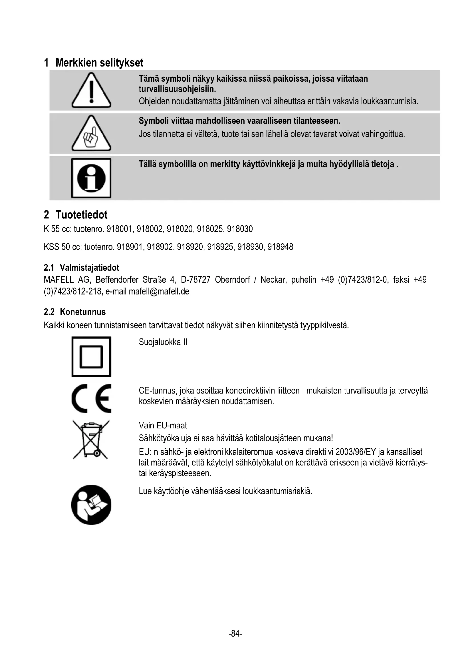 Tällä symbolilla on merkitty käyttövinkkejä ja muita hyödyllisiä tietoja . 2 Tuotetiedot K 55 cc: tuotenro. 918001, 918002, 918020, 918025, 918030 KSS 50 cc: tuotenro. 918901, 918902, 918920, 918925, 918930, 918948