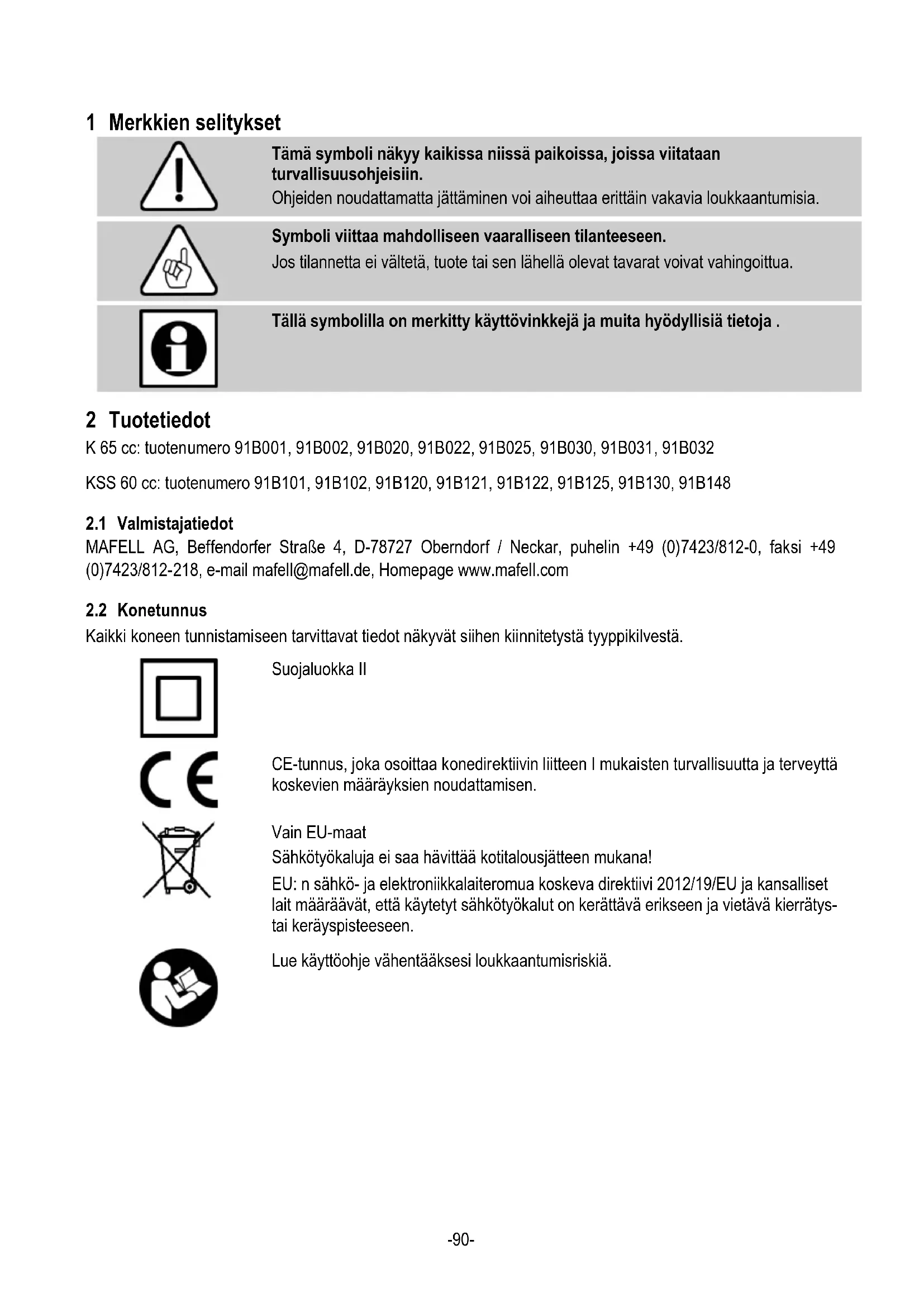 Tällä symbolilla on merkitty käyttövinkkejä ja muita hyödyllisiä tietoja . 2 Tuotetiedot K 65 cc: tuotenumero 91B001, 91B002, 91B020, 91B022, 91B025, 91B030, 91B031, 91B032 KSS 60 cc: tuotenumero 91B101, 91B102, 91B120, 91B121, 91B122, 91B125, 91B130, 91B148