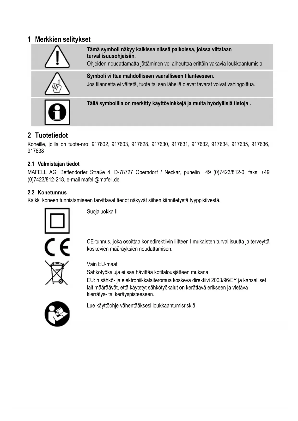 Tällä symbolilla on merkitty käyttövinkkejä ja muita hyödyllisiä tietoja . 2 Tuotetiedot Koneille, joilla on tuote-nro: 917602, 917603, 917628, 917630, 917631, 917632, 917634, 917635, 917636,