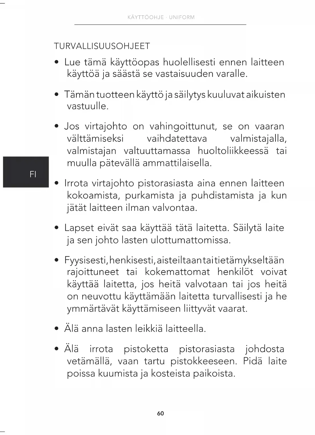 - Irrota pistoke pistorasiasta ennen kuin puhdistat tai huollat laitetta.
