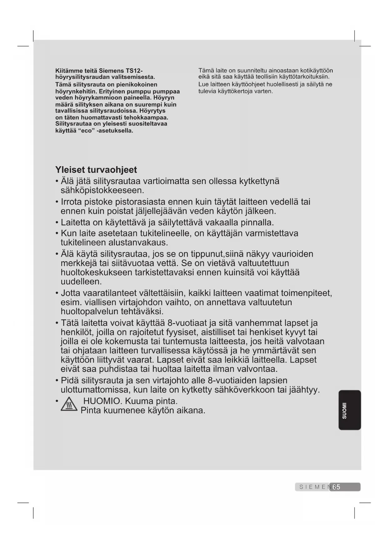 S I E M E N S SUOMI Kiitämme teitä Siemens TS12- höyrysilitysraudan valitsemisesta. Tämä silitysrauta on pienikokoinen höyrynkehitin. Erityinen pumppu pumppaa veden höyrykammioon paineella. Höyryn määrä silityksen aikana on suurempi kuin tavallisissa silitysraudoissa. Höyrytys on täten huomattavasti tehokkaampaa. Silitysrautaa on yleisesti suositeltavaa käyttää “eco” -asetuksella. Tämälaiteonsuunniteltuainoastaankotikäyttöön eikäsitäsaakäyttääteollisiinkäyttötarkoituksiin. Luelaitteenkäyttöohjeethuolellisestijasäilytäne tuleviakäyttökertojavarten. Yleiset turvaohjeet