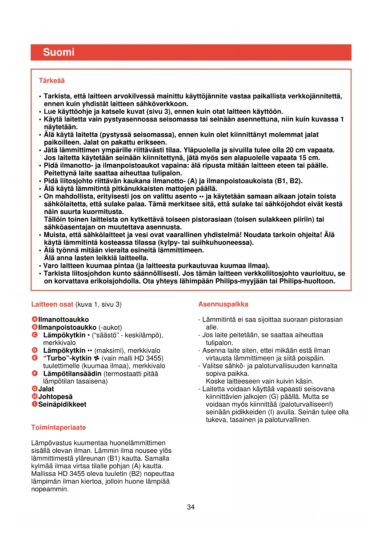Laitteen osat (kuva 1, sivu 3) A Ilmanottoaukko B Ilmanpoistoaukko (-aukot) C Lämpökytkin • (“säästö” - keskilämpö), merkkivalo D Lämpökytkin •• (maksimi), merkkivalo E “Turbo”-kytkin > (vain malli HD 3455) tuulettimelle (kuumaa ilmaa), merkkivalo F Lämpötilansäädin (termostaatti pitää lämpötilan tasaisena) G Jalat H Johtopesä I Seinäpidikkeet Toimintaperiaate Lämpövastus kuumentaa huonelämmittimen sisällä olevan ilman. Lämmin ilma nousee ylös lämmittimestä yläreunan (B1) kautta. Samalla kylmää ilmaa virtaa tilalle pohjan (A) kautta. Mallissa HD 3455 oleva tuuletin (B2) nopeuttaa lämpimän ilman kiertoa, jolloin huone lämpiää nopeammin. Asennuspaikka - Lämmitintä ei saa sijoittaa suoraan pistorasian alle. - Jos laite peitetään, se saattaa aiheuttaa tulipalon. - Asenna laite siten, ettei mikään estä ilman virtausta lämmittimeen ja siitä poispäin. - Valitse sähkö- ja paloturvallisuuden kannalta sopiva paikka. Koske laitteeseen vain kuivin käsin. - Laitetta voidaan käyttää vapaasti seisovana kiinnittävien jalkojen (G) päällä. Mutta se voidaan myös kiinnittää (paloturvalliseen!) seinään pidikkeiden (I) avulla. Seinän tulee olla tukeva, tasainen ja paloturvallinen. Tärkeää