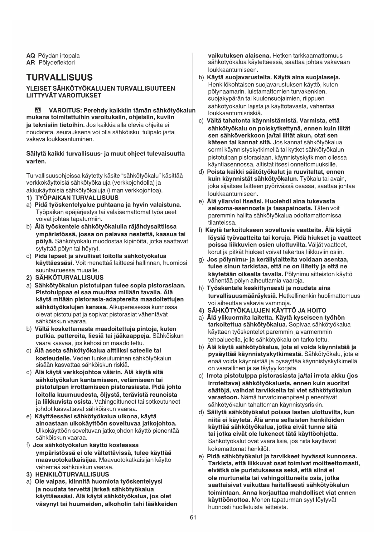 a) Älä ylikuormita laitetta. Käytä kyseiseen työhön tarkoitettua sähkötyökalua. Sopivaa sähkötyökalua käyttäen työskentelet paremmin ja varmemmin tehoalueella, jolle sähkötyökalu on tarkoitettu. b) Älä käytä sähkötyökalua, jota ei voida käynnistää ja pysäyttää käynnistyskytkimestä. Sähkötyökalu, jota ei enää voida käynnistää ja pysäyttää käynnistyskytkimellä, on vaarallinen ja se täytyy korjata. c) Irrota pistotulppa pistorasiasta ja/tai irrota akku (jos irrotettava) sähkötyökalusta, ennen kuin suoritat säätöjä, vaihdat tarvikkeita tai viet sähkötyökalun varastoon. Nämä turvatoimenpiteet pienentävät sähkötyökalun tahattoman käynnistysriskin. d) Säilytä sähkötyökalut poissa lasten ulottuvilta, kun niitä ei käytetä. Älä anna sellaisten henkilöiden käyttää sähkötyökalua, jotka eivät tunne sitä tai jotka eivät ole lukeneet tätä käyttöohjetta. Sähkötyökalut ovat vaarallisia, jos niitä käyttävät kokemattomat henkilöt. e) Pidä sähkötyökalut ja tarvikkeet hyvässä kunnossa. Tarkista, että liikkuvat osat toimivat moitteettomasti, eivätkä ole puristuksessa sekä, että siinä ei ole murtuneita tai vahingoittuneita osia, jotka saattaisivat vaikuttaa haitallisesti sähkötyökalun toimintaan. Anna korjauttaa mahdolliset viat ennen käyttöönottoa. Monen tapaturman syyt löytyvät huonosti huolletuista laitteista. AQ Pöydän irtopala AR Pölydeektori TURVALLISUUS