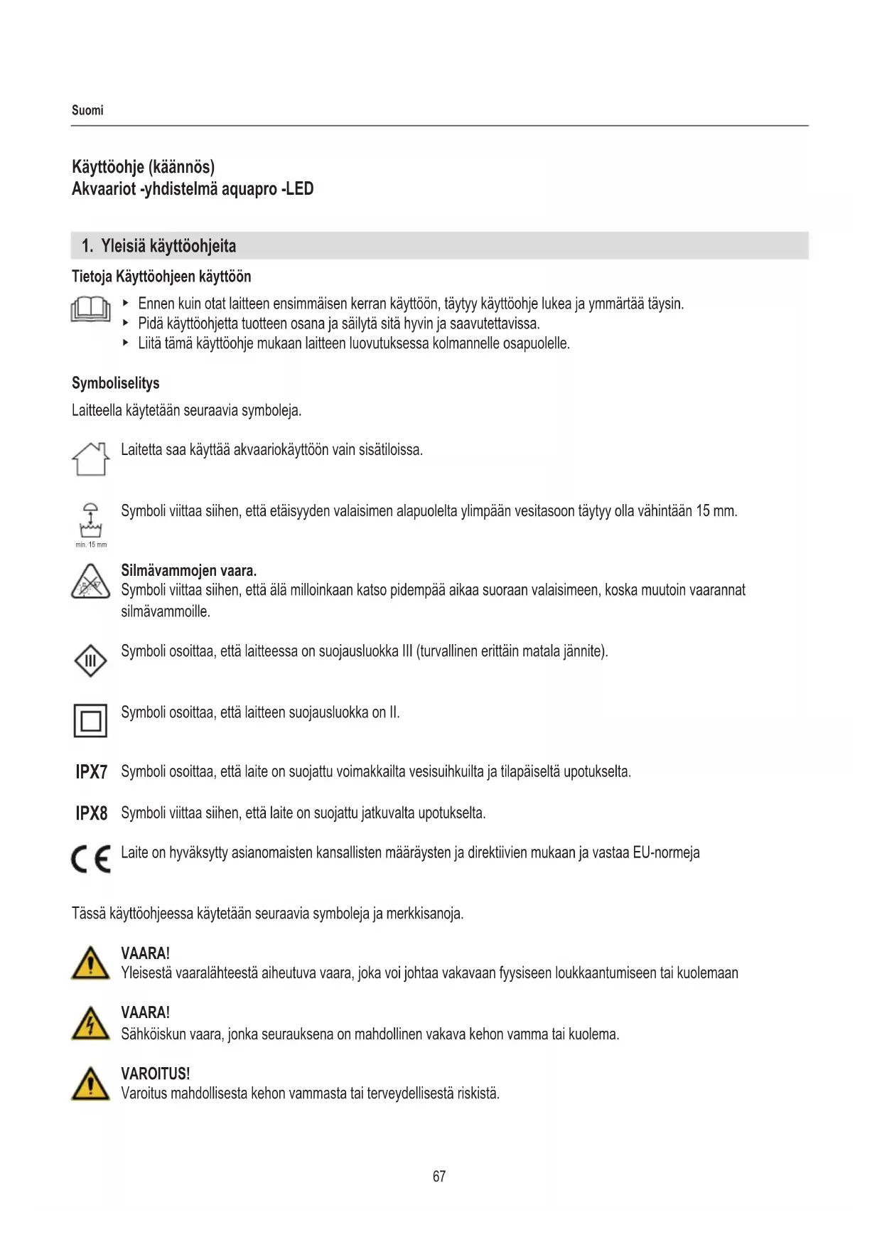 Tietoja Käyttöohjeen käyttöön ▶ Ennen kuin otat laitteen ensimmäisen kerran käyttöön, täytyy käyttöohje lukea ja ymmärtää täysin. ▶ Pidä käyttöohjetta tuotteen osana ja säilytä sitä hyvin ja saavutettavissa. ▶ Liitä tämä käyttöohje mukaan laitteen luovutuksessa kolmannelle osapuolelle. Symboliselitys Laitteella käytetään seuraavia symboleja. Laitetta saa käyttää akvaariokäyttöön vain sisätiloissa. Symboli viittaa siihen, että etäisyyden valaisimen alapuolelta ylimpään vesitasoon täytyy olla vähintään 15 mm. Silmävammojen vaara. Symboli viittaa siihen, että älä milloinkaan katso pidempää aikaa suoraan valaisimeen, koska muutoin vaarannat silmävammoille. Symboli osoittaa, että laitteessa on suojausluokka III (turvallinen erittäin matala jännite). Symboli osoittaa, että laitteen suojausluokka on II. Symboli osoittaa, että laite on suojattu voimakkailta vesisuihkuilta ja tilapäiseltä upotukselta. Symboli viittaa siihen, että laite on suojattu jatkuvalta upotukselta. Laite on hyväksytty asianomaisten kansallisten määräysten ja direktiivien mukaan ja vastaa EU-normeja Tässä käyttöohjeessa käytetään seuraavia symboleja ja merkkisanoja. VAARA! Yleisestä vaaralähteestä aiheutuva vaara, joka voi johtaa vakavaan fyysiseen loukkaantumiseen tai kuolemaan VAARA! Sähköiskun vaara, jonka seurauksena on mahdollinen vakava kehon vamma tai kuolema. VAROITUS! Varoitus mahdollisesta kehon vammasta tai terveydellisestä riskistä. min. 15 mm IPX7 IPX868 Suomi VARO! Esinevahinkojen vaaraan liittyvä ohje. Ohje hyödyllisten tietojen ja vinkkien kanssa. Esityssopimus Viittaus kuvaan, tässä viittaus kuvaan A Sinua pyydetään toimimaan.