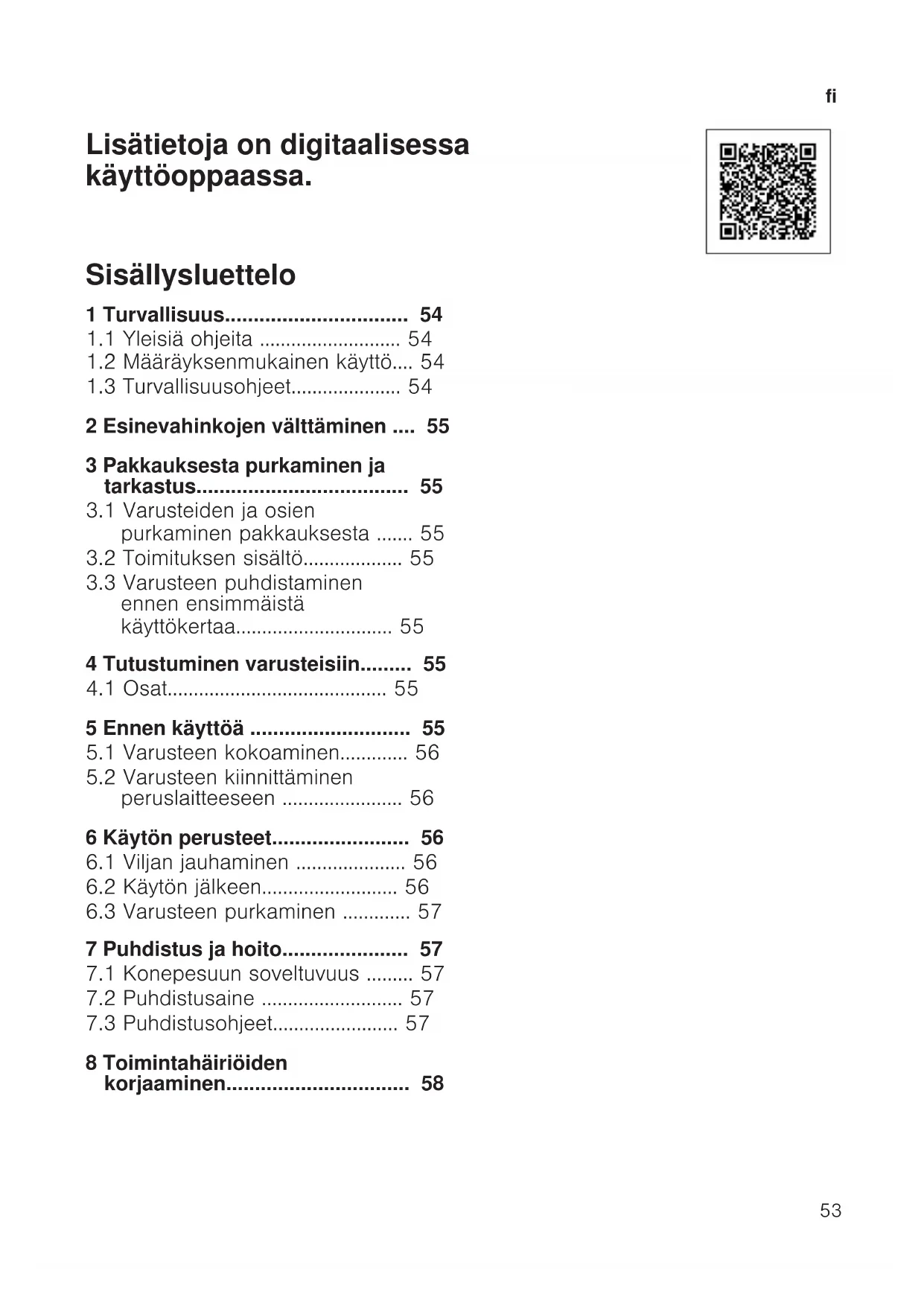 Lisätietoja on digitaalisessa käyttöoppaassa. Sisällysluettelo 1 Turvallisuus................................54